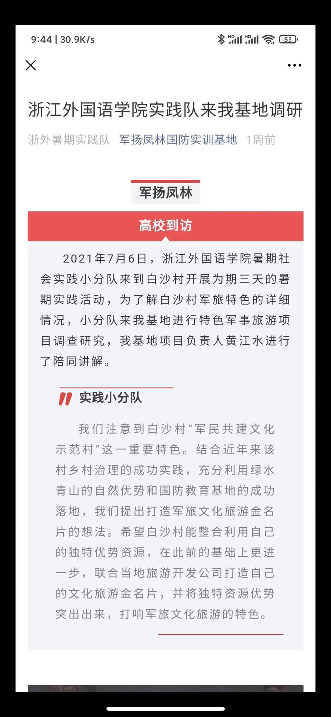 白沙村是“军民共建文化示范村”,拥有独特的军旅文化优势资源。据此,队员们开展了对当地军民文化印记和军旅主题的调研。当地军旅特色旅游项目的负责人带领队员了解了当地的军事文化旅游情况。同时,江山市汝南周氏文化研究会会长周建才带领队员们参观了“六十六后方医院”抗战纪念馆。队员们在观看了周老先生自制的《碧血青冢——抗战医院在凤林》纪录片后,了解了当时后方医院的艰苦环境和抗日战士的坚韧意志,深受感动和震撼。