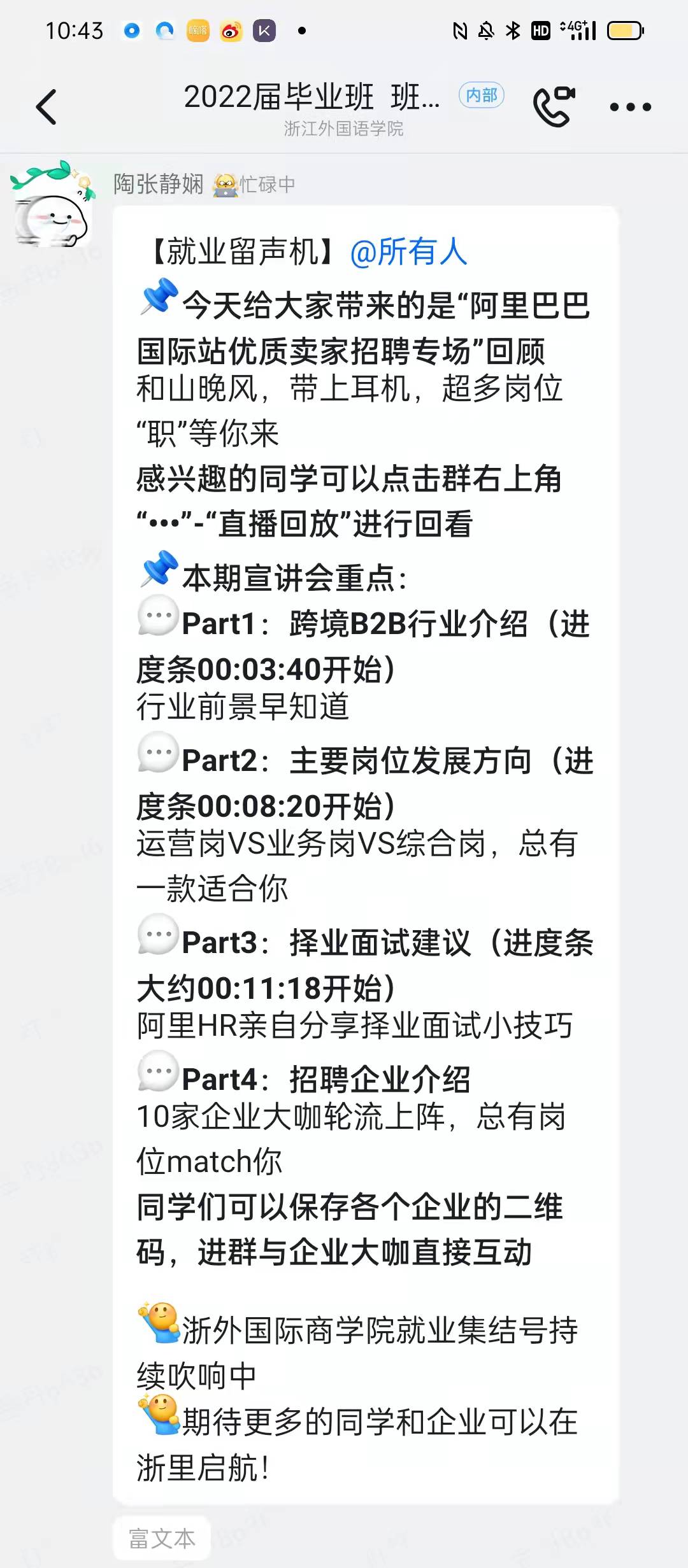 为做好疫情背景下的就业工作,国际商学院依托“智慧学工”推出“线上+线下”双线联动的新型就业服务。创新推出“就业服务直播间”就业服务。联合阿里巴巴等企业开设“就业服务直播间”,为用人单位和毕业生牵线搭桥。在直播间,毕业生可以与就业单位进行时时互动,及时捕捉就业信息。同时学院官微同步推出“就业集结号”栏目,向全体毕业生发布就业宣讲预告。建立就业信息台账,助力学生精准对接企业需求。为帮助学生找到迅速找到心仪的岗位,学院学生辅导员帮助学生及时整理招聘信息并标注重点信息和提醒回看的信息,建立详细就业信息台账,精准对标企业需求输送毕业生。