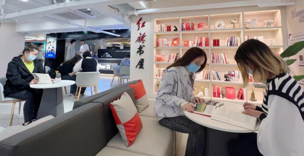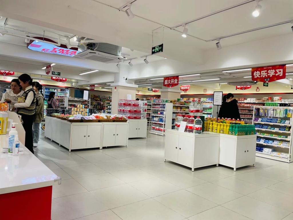 商圈的一侧,映入眼帘的是一站式学生社区。该社区以“共创、共享、共育”为核心理念,涵盖多种业态,提供了校园生活休闲空间的全新体验。社区内的天猫超市里,洗护用品、食品饮料,一应俱全,一站式解决同学们的日常生活需求;面包店、水果店里,天然健康的各式面包和水果,充盈丰富你的味蕾;打印店、眼镜店,更是给师生带来便利的生活体验;还有党建园地——红旗书屋,师生在这里自由交流、探讨,开展互助式学习。寂静的清晨,清闲的午后,在这片静谧、悠闲的空间里,时光仿佛放慢了脚步,诗和远方好似近在咫尺。