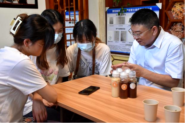 在与千岛湖好清蜜蜜蜂专业合作社负责人的交流中,成员们了解到中华蜂数量锐减的主要原因、当地蜜蜂的生长环境、汲取的粉源、中华蜂蜜的优势等。
