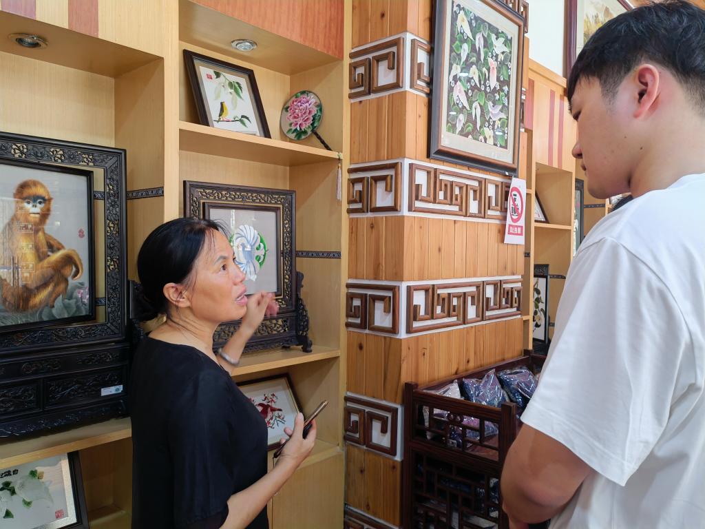 “松桃苗绣是苗族文化的载体,但是不能仅停留在刺绣上,而要诠释好背后的故事,让刺绣产生更大价值。”在苗绣手工艺术文化中心,石丽平为队员们着重介绍了《鸽子花旋极图》背后的设计理念,仅有的一片绿叶象征着唯一的地球,花朵在苗绣的点染下,变幻为鸽子形象,象征着和平,一叶、一花、一鸟,三者相织相汇,浑然一体,寓意着“人类命运共同体”。2013年,“鸽子花”被联合国作为外交礼品使用。她还将“鸽子花”与苗族文化、现代时尚元素充分融合进行创作,打造了“鸽子花·松桃苗绣”文化品牌,目前已销往67个国家和地区,得到了国际友人的赞美和认可。