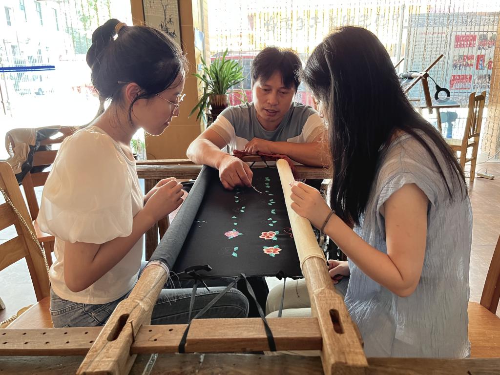 在“绣爷”杨光荣的指导下,队员们还亲身体验了苗绣的一针一线。学习过程中,队员们积极开拓互联网传播渠道,通过直播介绍苗绣基地和刺绣工艺。大家不仅探索了针尖上的奥秘与魅力,也通过新媒体平台让苗绣活跃在更多年轻人的视线中。