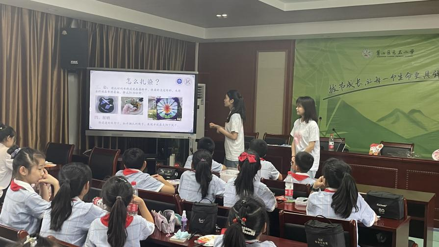 继承非遗文化,绽放扎染之美。在《“小小扎染师”——植物拓印扎染手工》课上,实践队向孩子们介绍了扎染、拓印的历史、现状与制作过程,带领孩子们感受扎染与拓印的独特魅力,激发孩子们自觉保护传承中华民族非遗文化的意识。课后,同学们相互分享制作的扎染作品:“我们要把智慧创造的美传承下去,让世界领略独中国的扎染之美。”