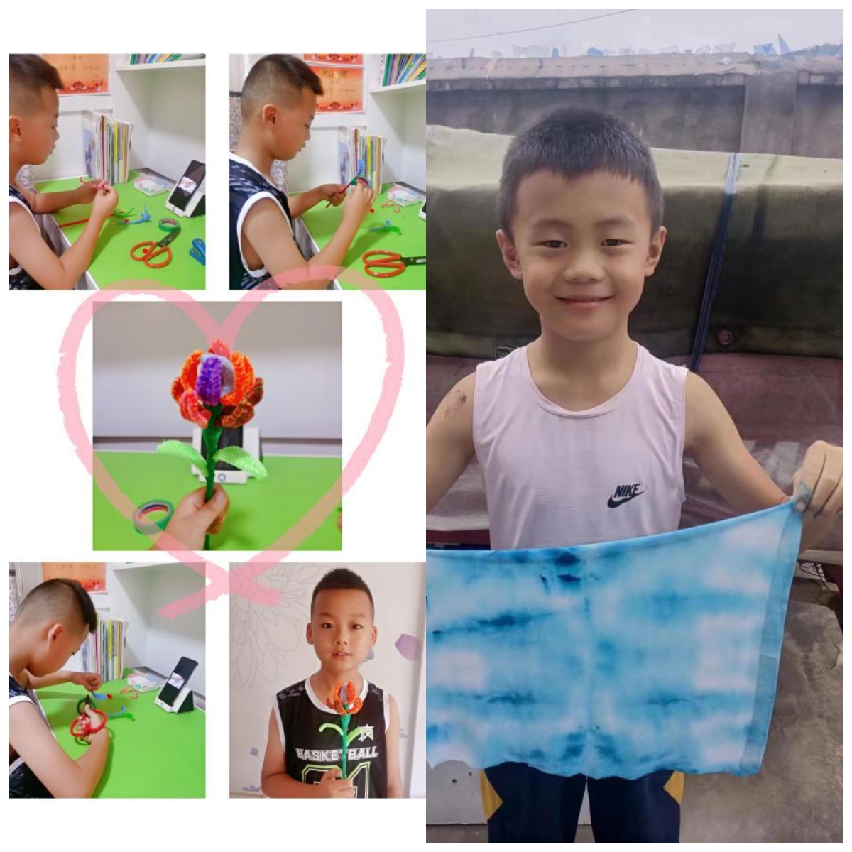 延川东关小学同学们制作的扭扭棒和扎染作品。