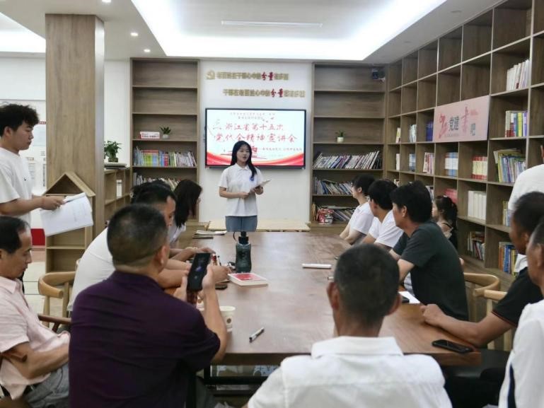 在村委会一楼党建展厅,团队宣讲员结合省党代会中提出的“高水平推进文化强省建设,打造新时代文化高地”,从泰顺县“旅游主业化,全域景观化”,雅阳镇坚持党建引领,打造氡泉特色小镇发展思路及开云官网的智力帮扶工作等内容,讲述雅阳镇“启明学堂”“八乡公学”的发展历程,生动展现了省党代会提出的精神共富与文化自信。