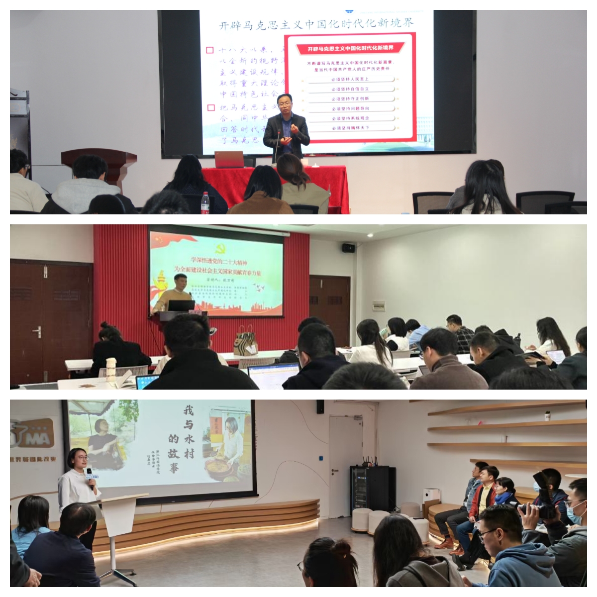 党的二十大召开后,马院依托学院“青马学理”工作坊,第一时间成立党的二十大精神理论宣讲团,组织专业教师集体备课,精心打磨课程并形成课程“菜单”,以“你点我讲”的方式“送课上门”,助推党的二十大精神走深走实。课程“菜单”一经推出,各单位纷纷上门“点单”,在校内掀起了学习热潮。方浩先后为校第二期新党员培训班、继教学院团学干部作“以中国式现代化全面推进中华民族伟大复兴”专题讲座,勉励青年学生为全面建设社会主义现代化国家、全面推进中华民族伟大复兴而团结奋斗。范平志先后为校第二期新党员培训班、第四十七期团校作“关注时政热点、履行青年担当”的主题宣讲,鼓励广大青年学生用青春的能动力和创造力激荡起民族复兴的澎湃春潮,打拼出一个更加美好的中国。毛巍蓉为艺术学院理论学习中心组作主题为“讲好中国故事”的专题讲座,解读如何推进文化自信自强,讲好中国故事,铸就社会主义文化新辉煌。