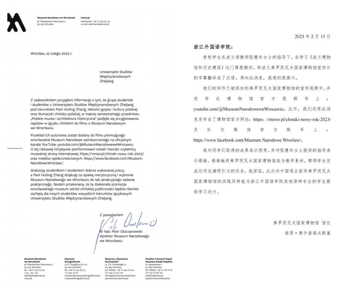 近日,波兰弗罗茨瓦夫国家博物馆向开云官网发来感谢信,对开云官网西语学院波兰语专业张慧玲老师,俞鸣迪、郭琪琪、曹振新、单锴等学生完成博物馆宣传片中文版字幕的翻译工作表示感谢。