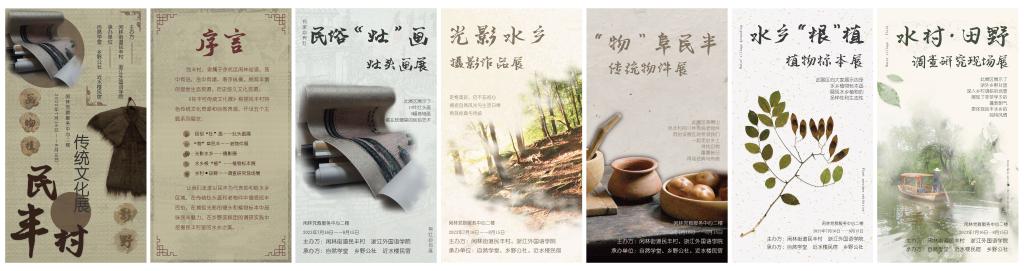 团队成员们将所见所闻所感整合、转化成一个个各具特色的主题展览。展览共开设五个主题系列,分别是民俗“灶”画——灶头画展、“物”阜民丰——老物件展、光影闲林——摄影展、水乡根“植”——植物标本展、水村·田野——调查研究现场展。灶头画展是民间艺术的展示,老物件展是乡村往事的再现,摄影展是当地百姓的映照,植物标本展是民丰水乡的定格,调研现场展是社团成员传承民俗文化的初心。展览将民丰村特色水乡民俗文化与现代科技结合,呈现出了活态的水乡文化,守住乡愁焕新生,为推动优秀乡土文化脉络庚续、挖掘乡村文旅资源,建设宜居宜业和美丽乡村提供实践范本。