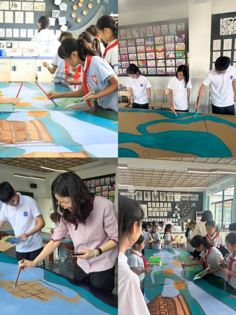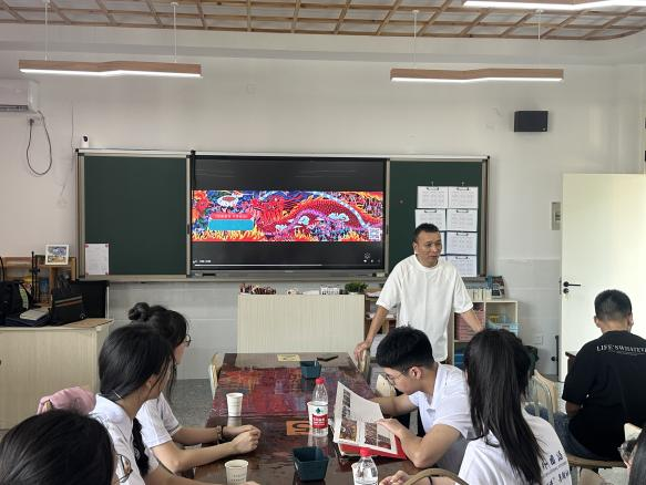 队员们来到畲县鹤溪小学,采访了《龙凤呈祥共享亚运》的创作团队,与当地的美术教师进行深入交流。团队负责人介绍,该画宽80厘米、长600厘米,是杭州第19届亚运民族画百米长卷之一,被杭州亚运会博物馆收藏,半生宣设色,畲乡景宁畲族民间绘画团队十名成员用时一个多月,记录了七个畲族场景,并以浓烈的色彩、奔放的畲族龙凤为主体,将亚运竞赛运动项目剪影与畲族彩带相缠相绕、柔美婉转,体现出龙凤呈祥的主题。队员们在采访中了解到民族画创作的艰辛,了解到畲画成员一边创作一边上课,还对有限的乡村美术课程资源整合再开发的不易。实践中,队员认识到地方美术传统文化传承的重要性,切实体会到畲画团队以及基层美术教师们吃苦耐劳、团结奋斗的精神。实践引发队员们深思,如何将新时代的艺术课程、美学思维更好地与不同地域、不同民族的传统文化深度结合,探索出一条美术修为上学习和发展的新路子。