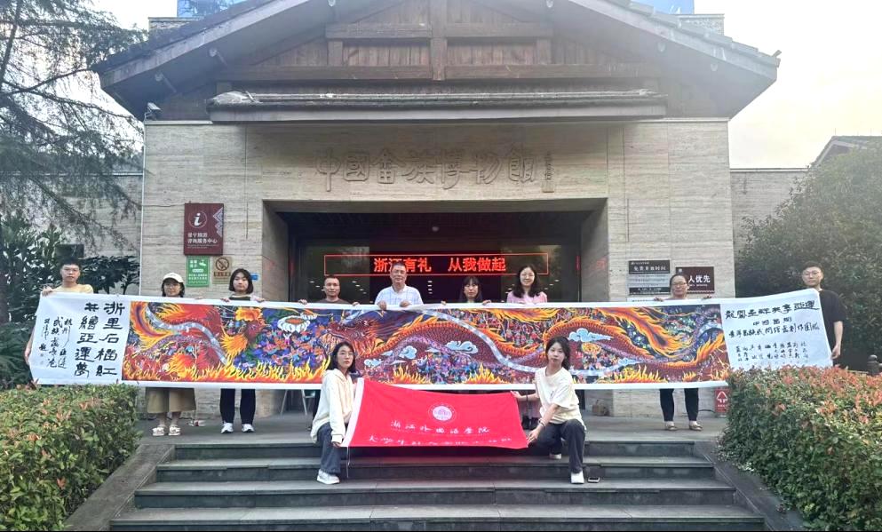 厉雷隆:我们实地调查景宁畲族地方区域,如东抗镇、澄照乡、参观中国畲族博物馆、采访亚运民族画长卷《龙凤呈祥共享亚运》的创作者,走访景宁鹤溪小学,与当地老师学生一起创作喜迎亚运会长卷等。在这样的美术共同创作中,我对景宁的发展历程、畲族的民俗风情有了更深的理解。