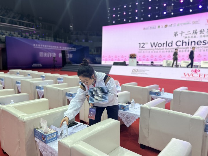 布置世界华人经济论坛会场。