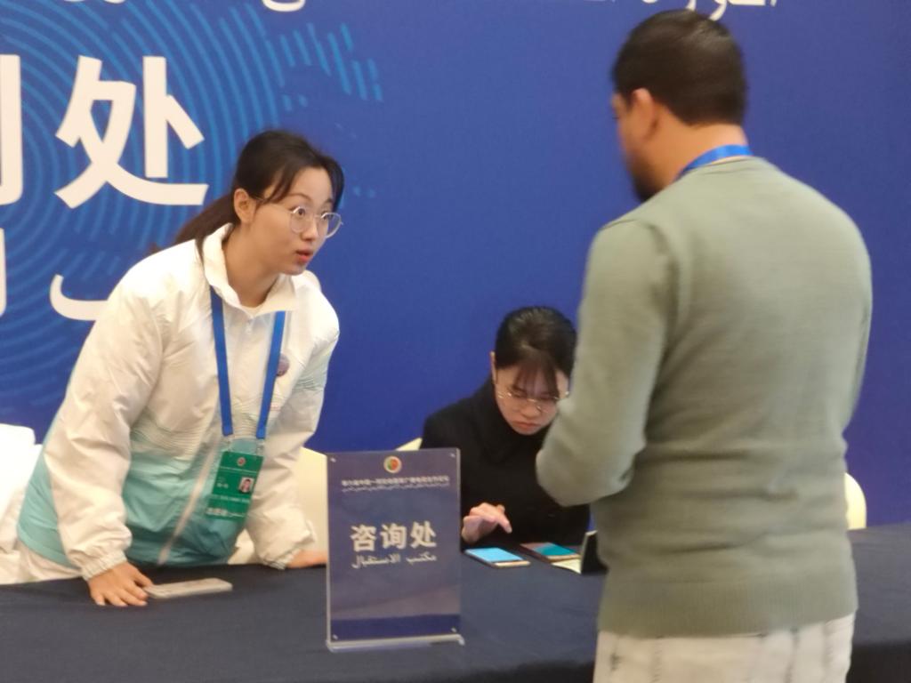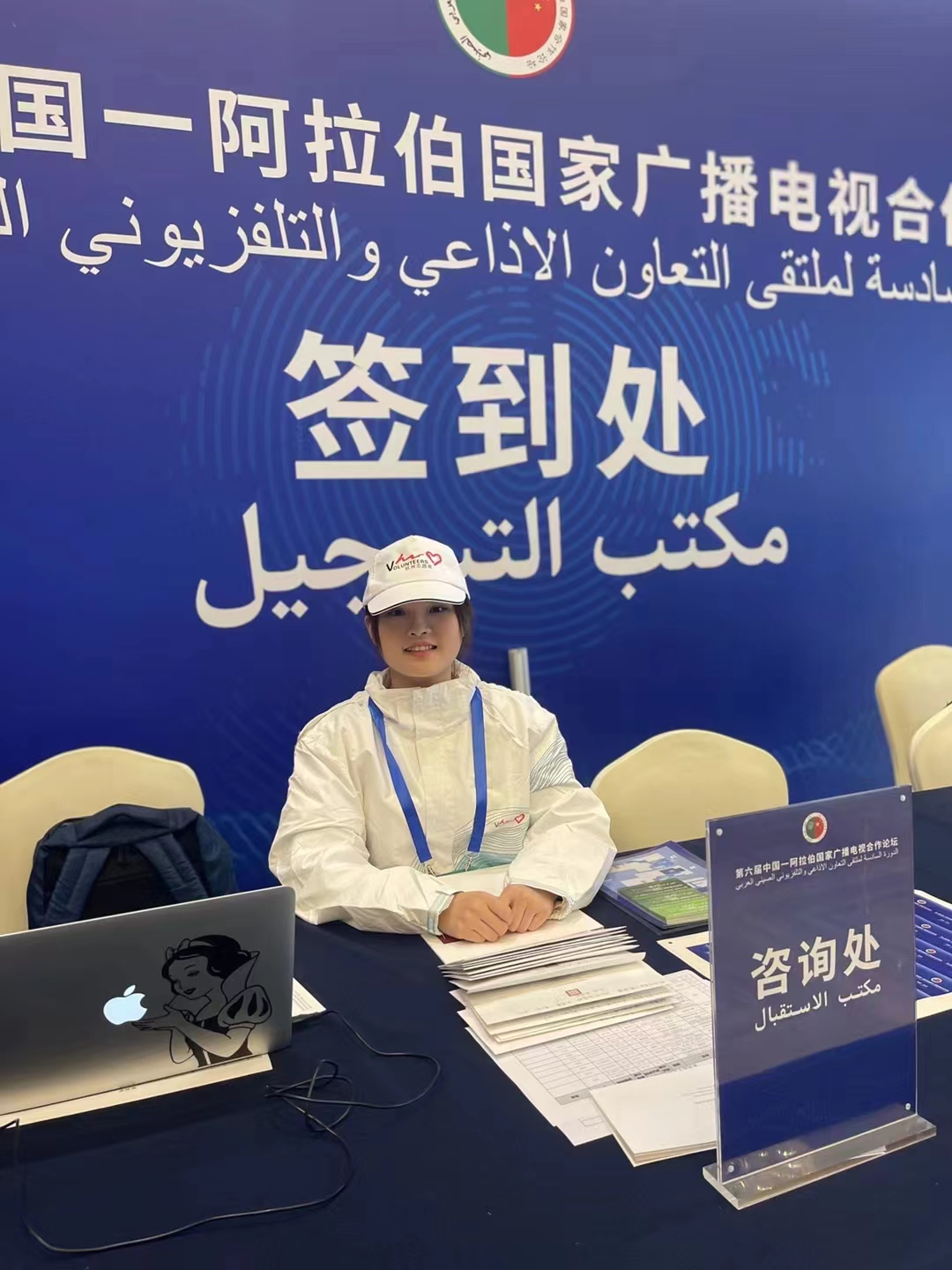 罗语桐因亚运会、亚残运会期间担任伊拉克代表团NOC助理与阿拉伯人民结缘。在这次论坛志愿服务中,她负责酒店接待和论坛现场语言服务及场地引导。当看到熟悉的中东面孔,听到熟悉的阿拉伯语,亲切感油然而生。她始终铭记要用微笑和语言搭建中阿沟通的桥梁,在志愿服务中向外宾介绍中国在广播电视方面的技术、中国的文化。