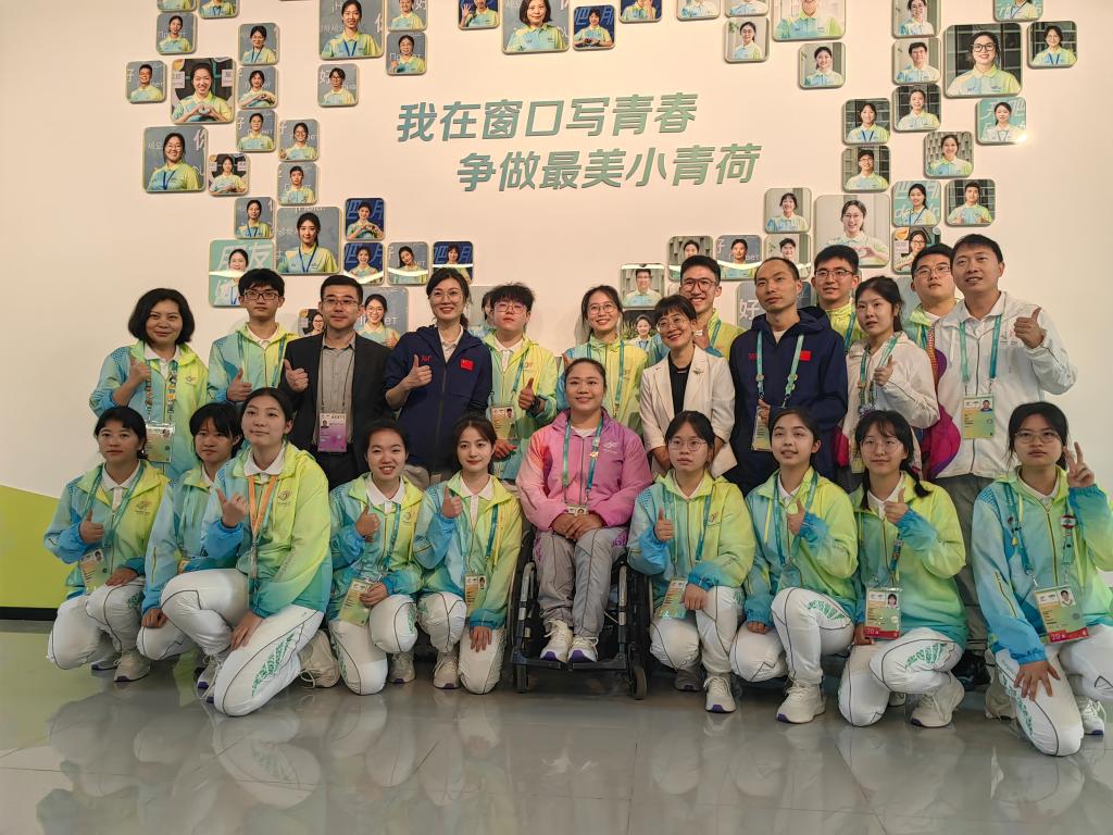 学生与杭州第4届亚残运会首棒火炬手谭玉娇面对面交流。