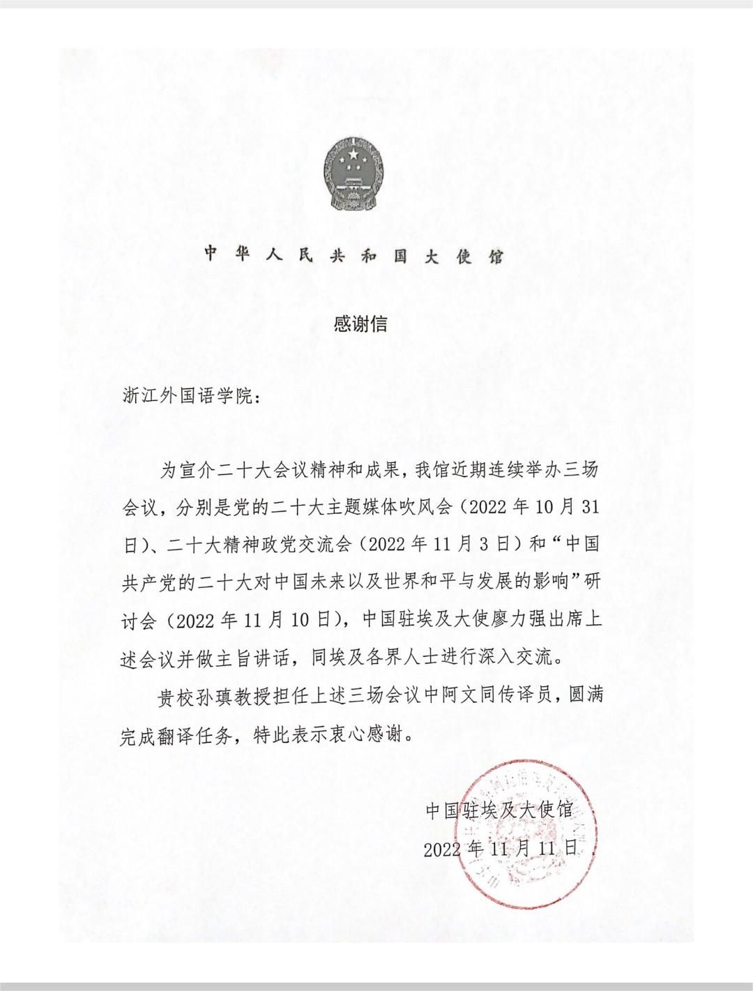 孙瑱教授为中国驻埃及大使馆提供阿拉伯语同传服务。