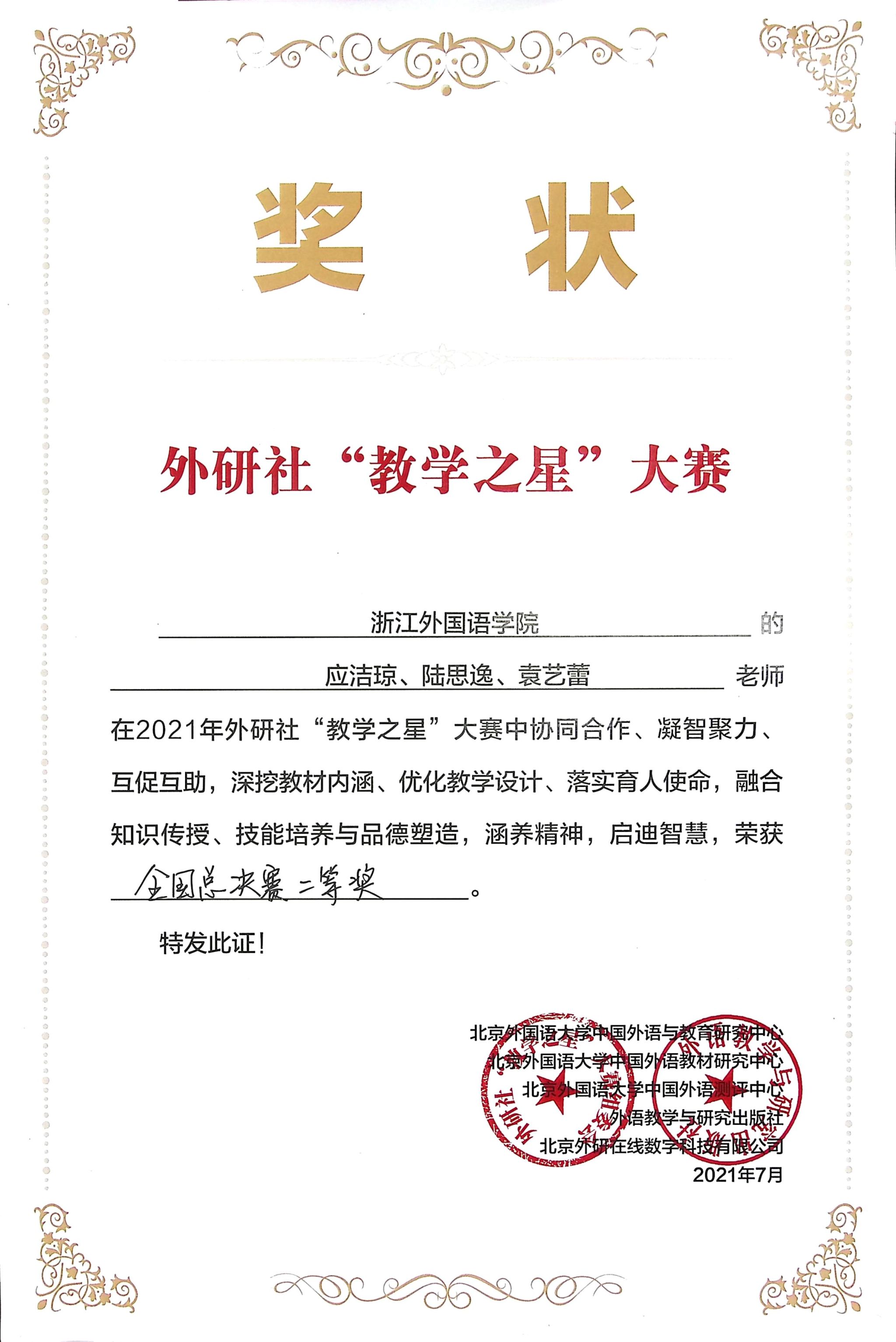 学院应洁琼老师教学团队获外研社“教学之星”大赛全国总决赛二等奖。