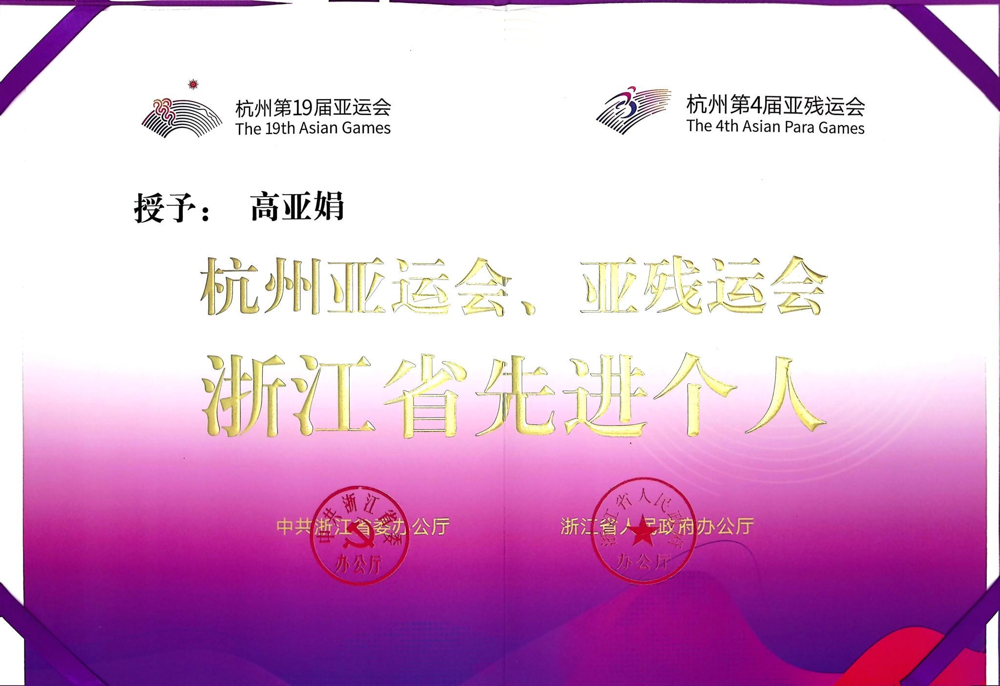 学院高亚娟老师被评为“杭州亚运会、亚残运会浙江省先进个人”称号。
