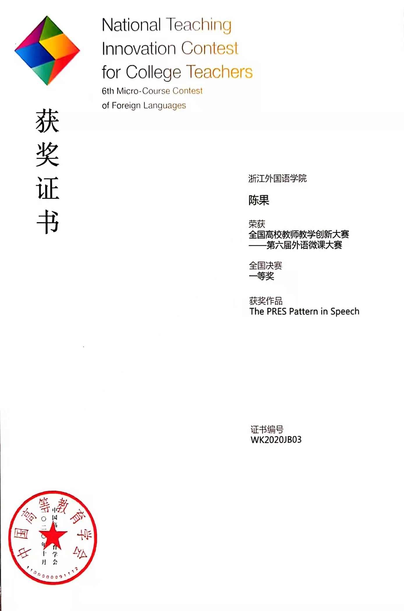 学院陈果老师获全国高校教师教学创新大赛-第六届外语微课大赛全国决赛一等奖。