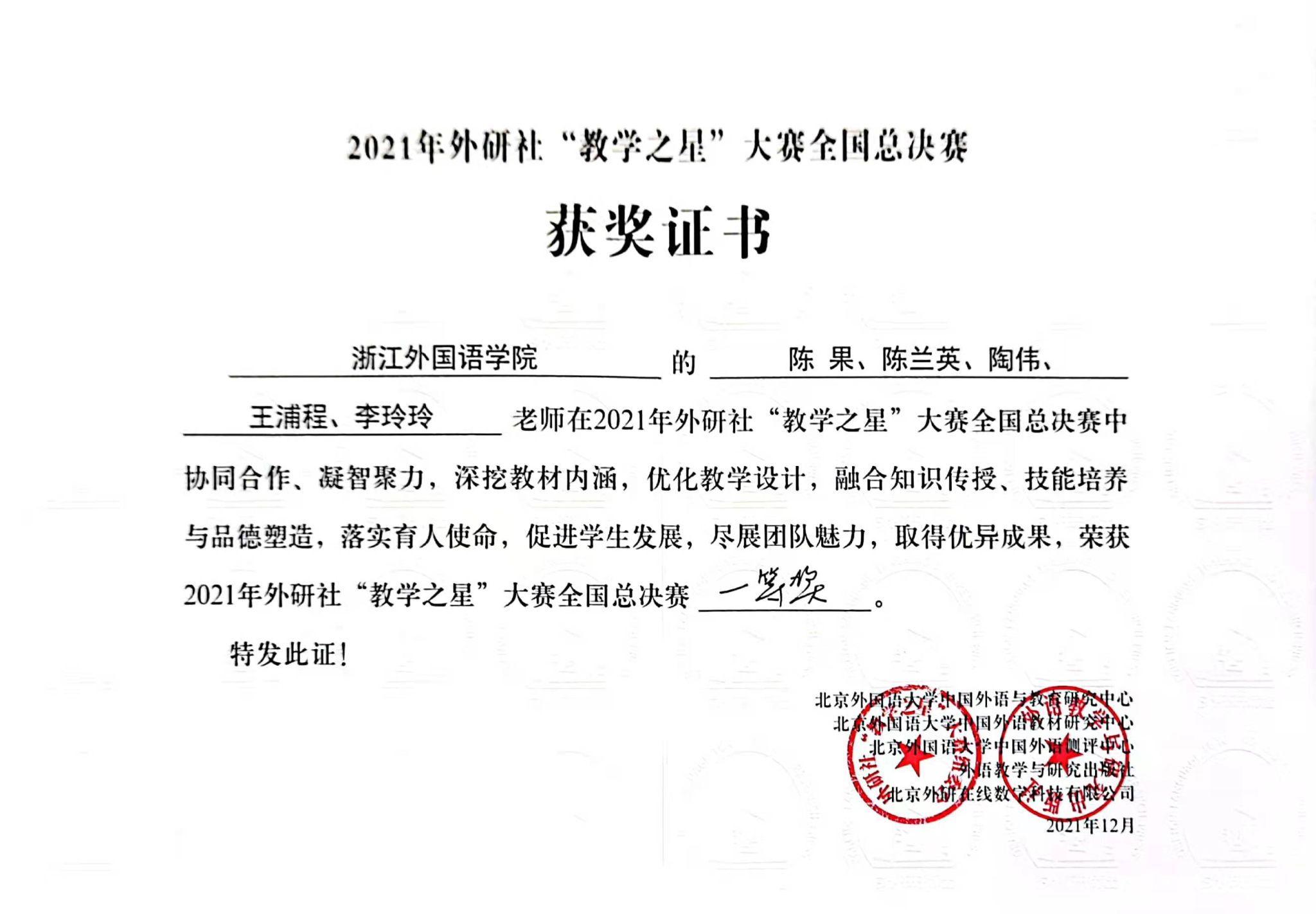 学院陈果老师教学团队获外研社“教学之星”大赛全国总决赛一等奖。