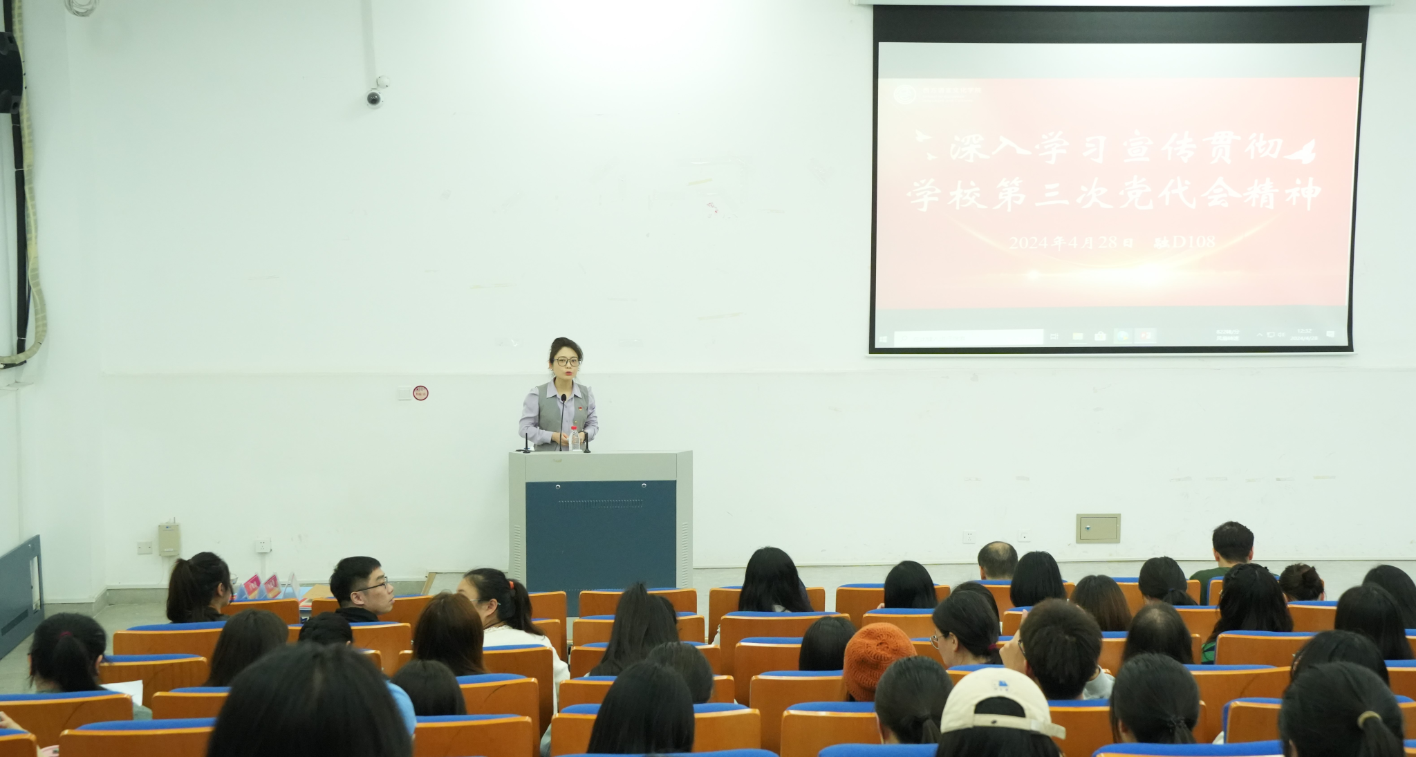 为全面准确理解并落实好学校第三次党代会精神,4月28日,西语学院组织全体教职工、学生党员、各年级学生骨干代表开展校第三次党代会精神集中学习会。战略处处长徐秀萍受邀作党代会工作报告解读。