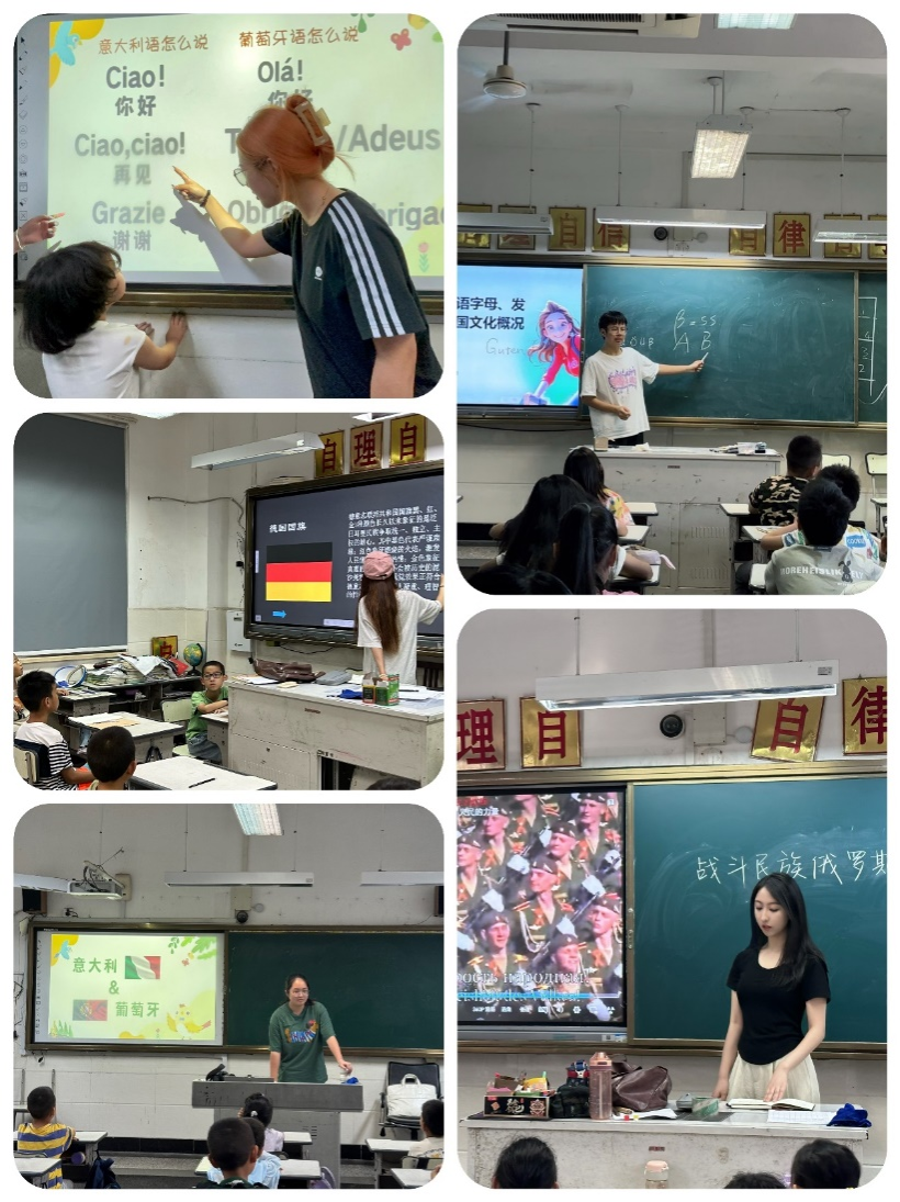 “Guten Tag(早安)、Какдела(你过得还好吗?)、Grazie(谢谢)、Olá(你好)……”在多语种课堂上,孩子们专注聆听每一个单词的发音,用心模仿、齐声朗读。团队还采取“角色扮演、互动游戏”模式,激发学生对外语学习的积极性。这个暑期多语种课堂已经开设4年,设有俄语、德语、葡萄牙语、意大利语等多语种,实践团队成员通过生动有趣的教学方式,带领学生们领略不同语言的魅力。学生们在学习过程中,不仅能够掌握各种语言的基础知识,还能够了解各个国家的风土人情和文化特色。此外,实践团队还组织了各种语言实践交流活动,引导孩子们拓宽视野,多维度了解世界。“看到孩子们对多彩世界的向往,有‘十万个为什么’等着我去解答,我感受到学习外语新的意义。”21俄语专业章鑫丹说。