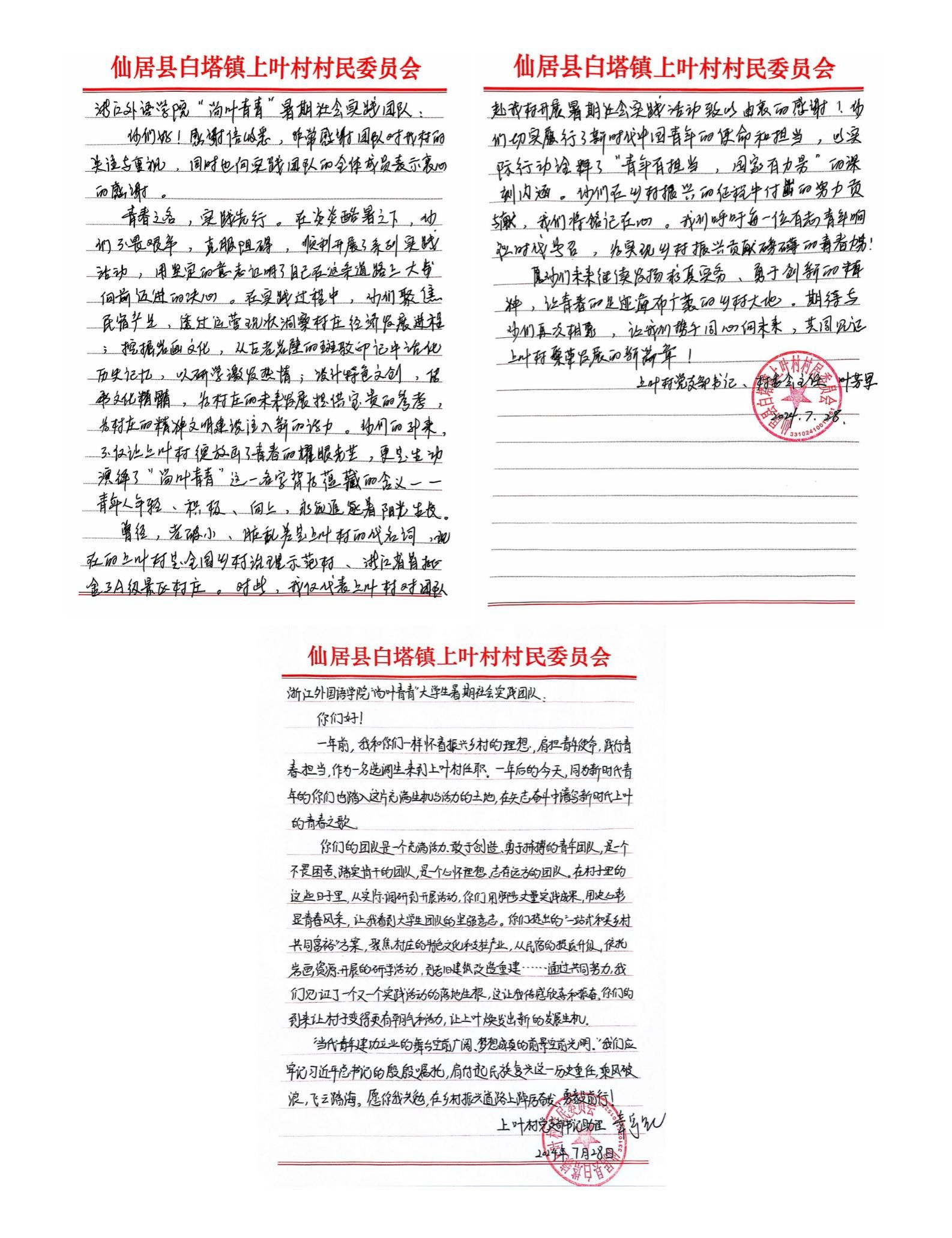“你们以实际行动诠释‘青年有担当,国家有力量’的深刻内涵,为村庄的未来发展提供宝贵的参考,为村庄的精神文明建设注入新的活力……”7月29日,kaiyun开云官方“尚叶青青”暑期社会实践团队收到了来自仙居县白塔镇上叶村的两封感谢信,信中感谢该团队活化了本村的各类历史文化资源,为促进乡村文明共富提供了新路径。