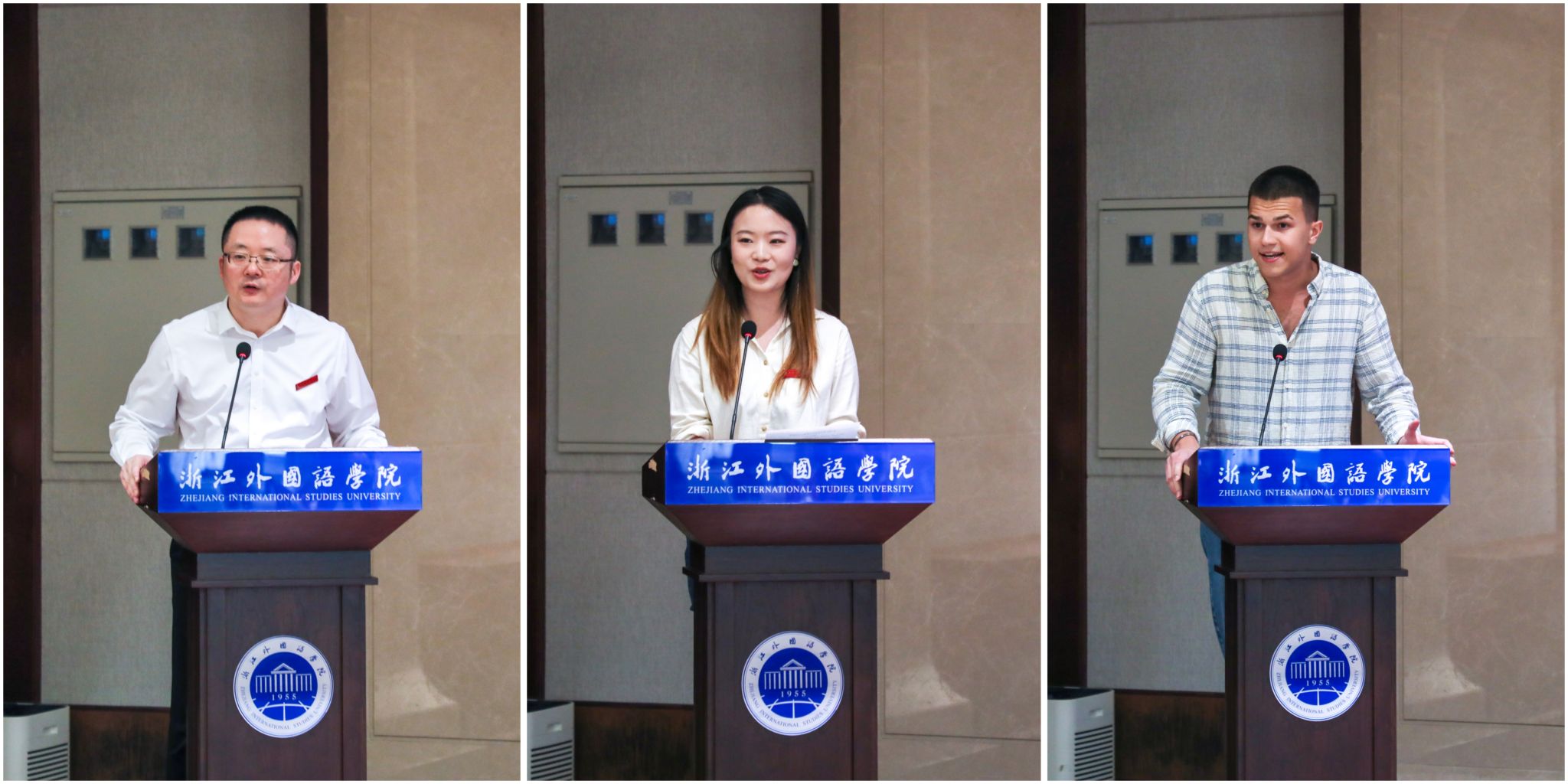 陈利强院长致辞、汪河老师发言、丹尼尔发言(从左至右)