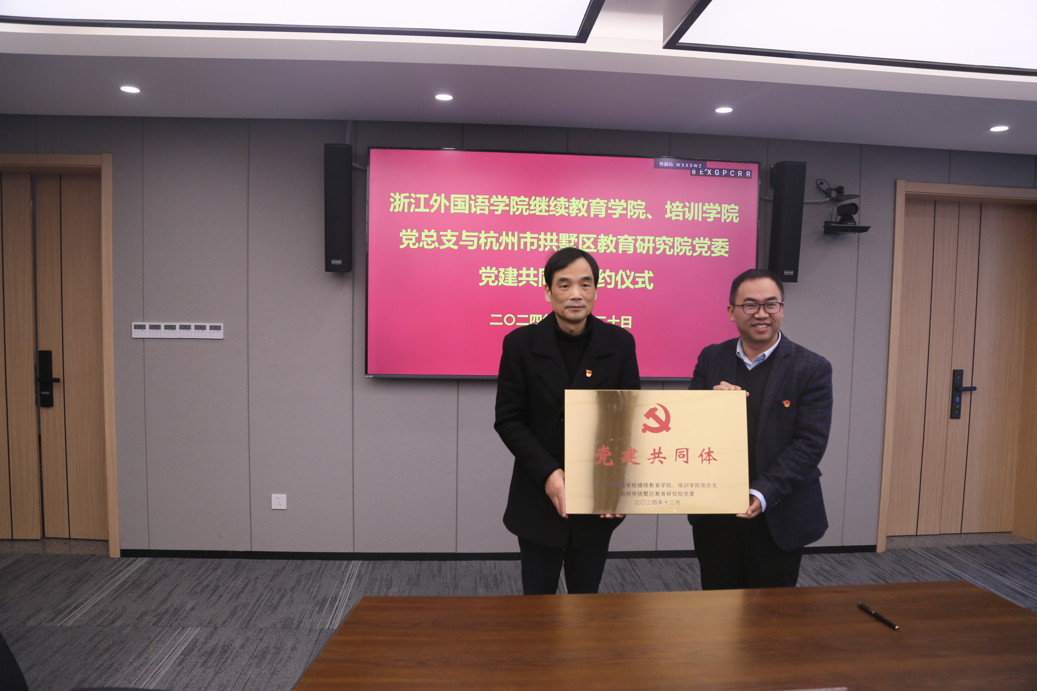 12月20日,继教学院、培训学院党总支与杭州市拱墅区教育研究院党委举行党建共同体签约、授牌仪式。签约后,双方将开展常态化的党建联建工作,特别是在教育资源共享、党员教育培训、学术交流、实践考察等方面开展共建活动。
