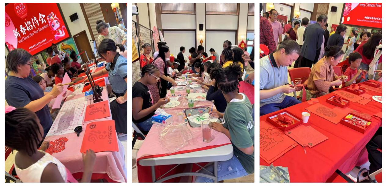 表演结束后,中外嘉宾还参加了安巴孔院与中国驻安巴大使馆、华人华侨联合开展的书法、剪纸、绘画和茶艺活动。孔院试点学校中文班的学生在传扬中国非物质文化遗产的同时,也向华人华侨和安巴民众送上了蛇年的美好祝福,展现中国文化的独特魅力。