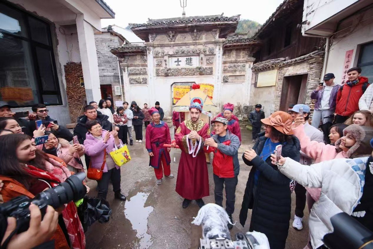 “状元归乡”实景演出,还原了古代状元衣锦还乡的荣耀场景。随着十二声铜锣震碎山间寂静,有幸抽中状元签的摩洛哥留学生AnwarBelighiti化身“洋状元”,身披红袍华服,在游客的簇拥下,跟随巡游队伍沿双峰皿溪迤逦而行,重现了“状元及第”盛景。他兴奋的说:“这是一次奇妙的体验,就像穿越回古代,感受到了中国传统文化的深厚底蕴。”