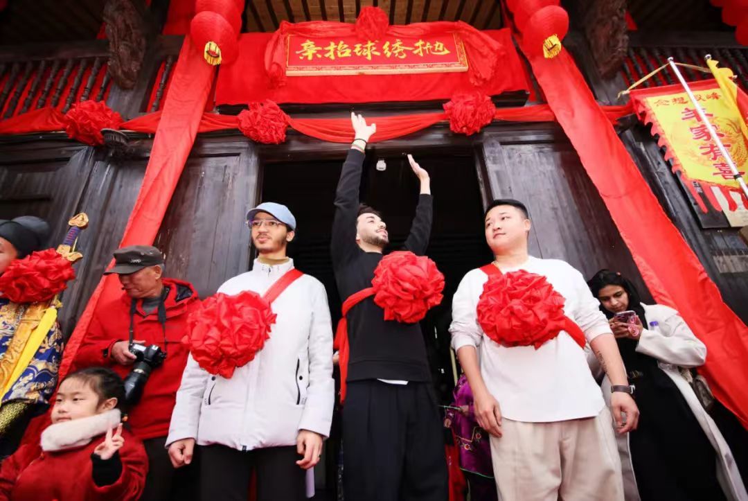 “抛绣球招亲”活动将年味推向高潮,引得现场游客跃起争抢。“原来中国古代用这样的方式传递爱意”,接到绣球的“洋新郎”在中式婚礼环节,与“新娘”共执红绸跨火盆、拜天地,体验了全套中式传统婚仪。