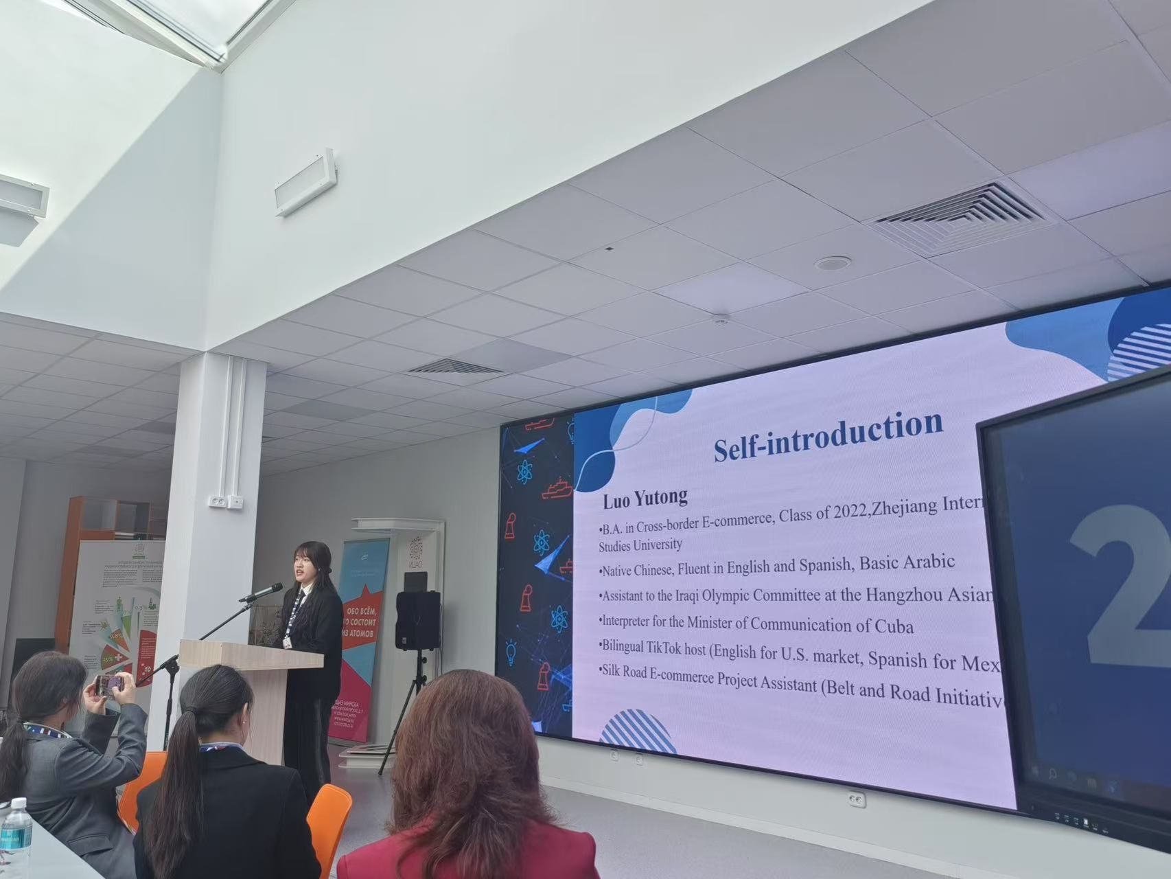 在优秀青年对话平行分论坛中,来自中国十所高校的学生代表与白俄罗斯国立大学学子展开深入交流。22级跨境电子商务专业的罗语桐以“从语言到世界”为主题,结合自身担任杭州亚运会“小青荷”、世界互联网大会陪同译员以及丝路电商社会实践的经历,分享了浙外学子在多语种学习与国际志愿服务经历中的收获与成长,生动诠释了如何通过语言桥梁和数字贸易推动跨文化理解与国际合作,展现了新时代中国青年的全球视野与责任担当。