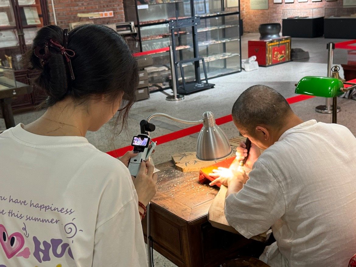 除了实地学习非遗技艺,同学们还充分发挥外语专业优势,拍摄系列双语宣传视频,展示非遗文化的独特魅力,向世界讲述中国非遗故事。在杭州十竹斋,实践团用镜头记录木板水印技艺。一位来自美国密苏里南方州立大学的学生在体验后感慨:“木板水印是一种很美的艺术,很美的文化,我也希望更多人能知道这种艺术和文化。”