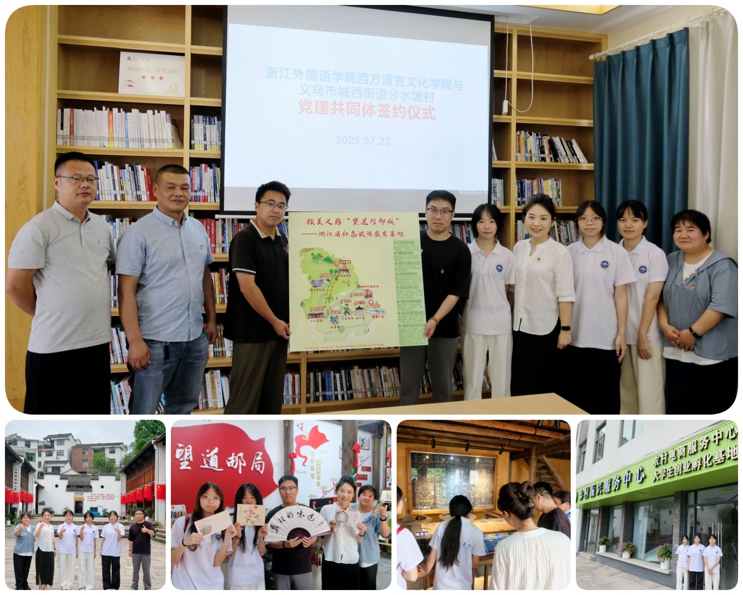 实践期间,西院学院党委与分水塘村党支部签订党建共同体协议。“实践团队的成果有助于我们进一步擦亮‘真理味道品牌’。”签约仪式上,城西街道何里共建委书记、分水塘村第一书记对实践团队表示高度赞赏。西语学院党委负责人表示,望道精神与浙外人才培养目标高度契合,学校正深化拓展国际传播、跨境电商、小语种培训等方面的社会服务合作,后续西语学院将以党建共同体建设为契机,引进望道故居红色资源赋能国际传播人才培养,为望道故居红色文旅和乡村振兴提供浙外支持。