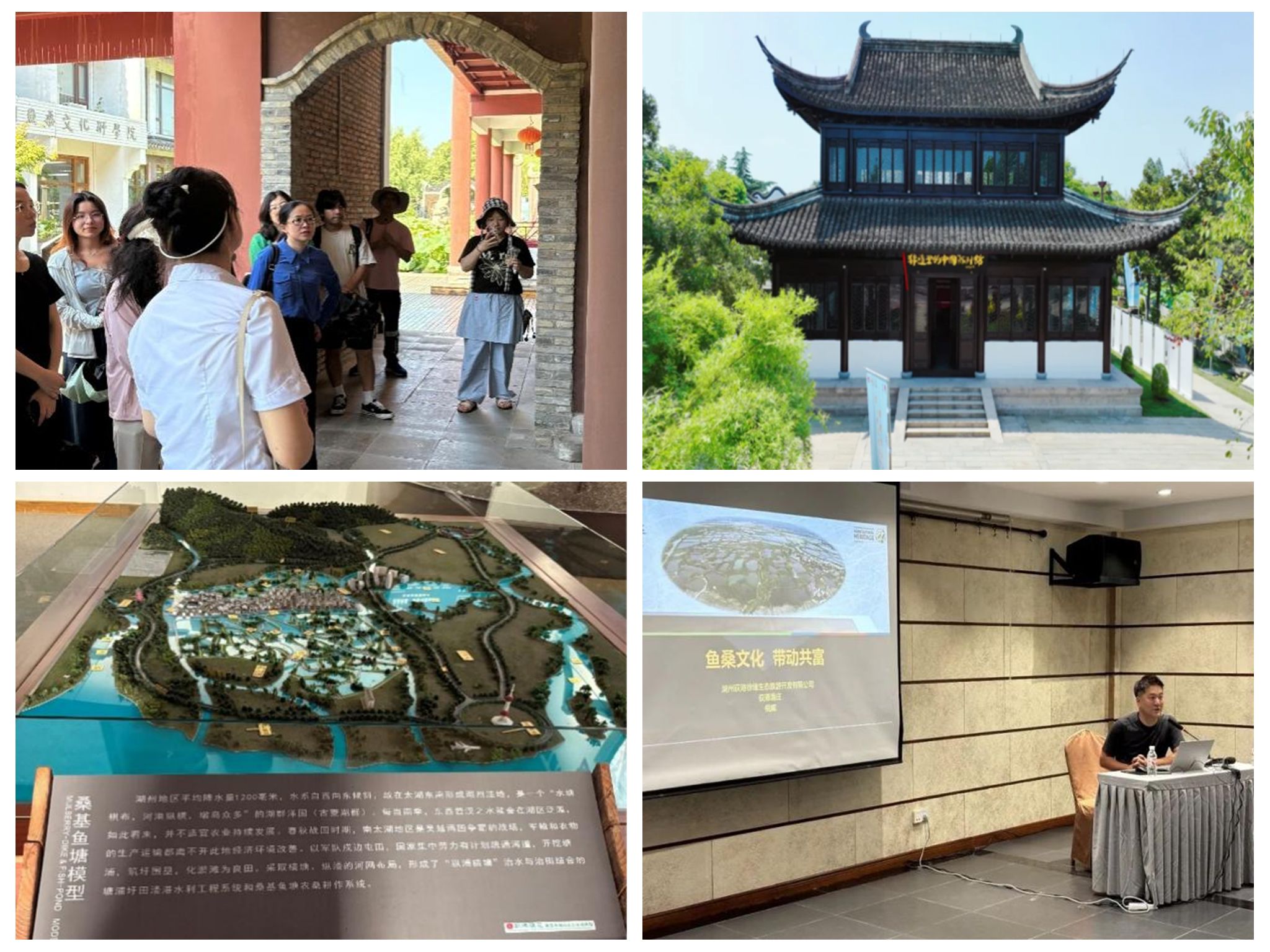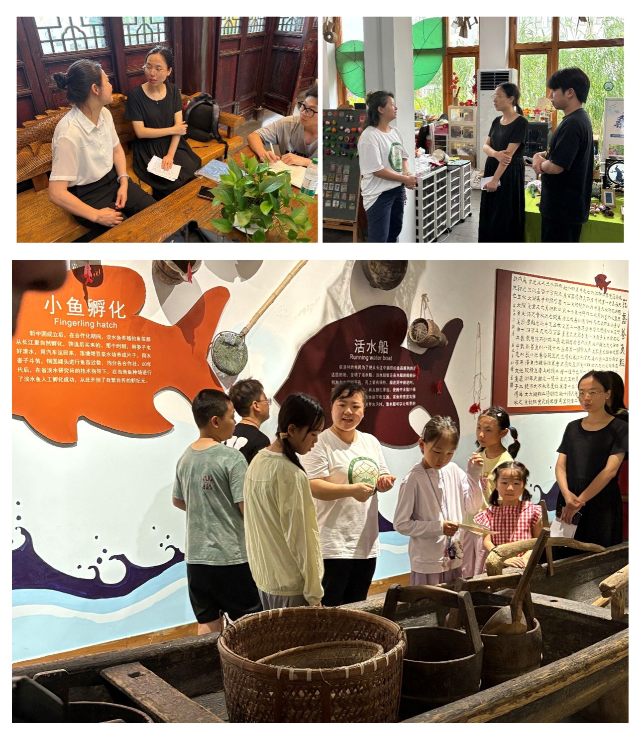 荻港村拥有被联合国粮农组织誉为“世间少有美景、良性循环典范”的桑基鱼塘系统。七月初,团队首次进驻荻港村。团队成员参观了桑基鱼塘系统历史文化馆、未来农场、荻港研学院及非遗里的中国陈列馆,全面了解了遗产保护利用与乡村产业融合发展的现状。团队与湖州荻港徐缘生态旅游开发有限公司(荻港渔庄)负责人进行了深入座谈交流,了解到渔庄作为唯一参与桑基鱼塘系统申遗工作的农业文化企业,通过创造就业、扶持创业、村镇共建、精准帮扶等举措,带动村民增收。但是,荻港村虽已开发40余种研学活动,却仍面临活动趣味性有待提升、课程沉浸式体验感不足、外界对资源认知度不高等现实挑战,亟需开发更具吸引力且富有教育内涵的研学课程。