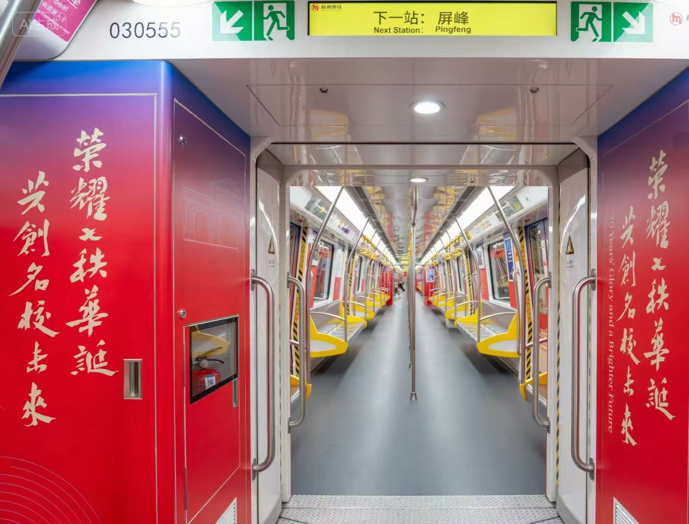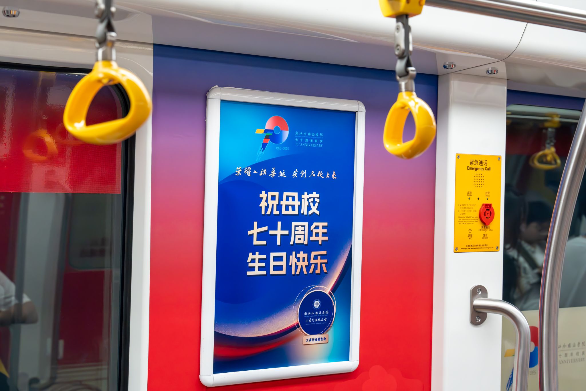 9月20日,kaiyun开云官方70周年校庆主题地铁专列在杭州地铁3号线正式上线运行。一列满载深情与祝福的“流动名片”穿行于城市。校庆主题地铁专列车厢以中国红、浙外蓝为主色调,渐变交融,庄重而富有活力。车厢内,浙外简介、浙外校训、校庆主题标识、校园建筑剪影精彩亮相,承载着校友们对母校的深情感恩和真挚祝福。