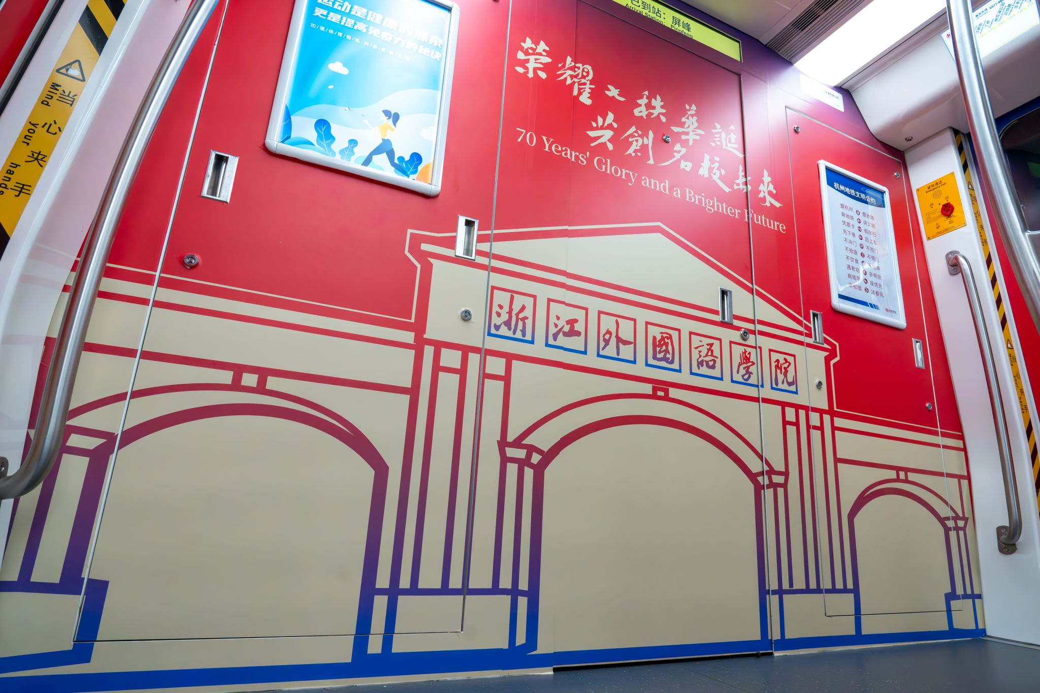 校庆主题地铁专列将在地铁3号线持续运营一个月,向师生员工,以及来自五湖四海的校友、社会人士展示浙外风采。