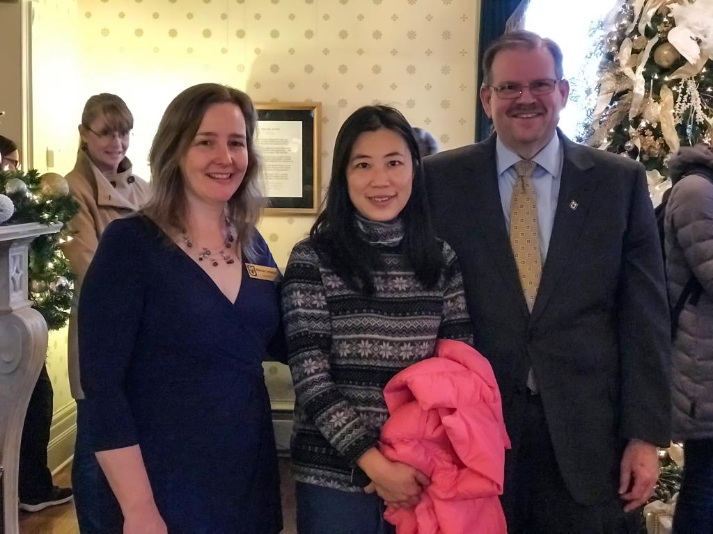访学期间,何老师有幸聆听到前新闻发言人、时任中国驻芝加哥总领事洪磊先生的讲座,在合影的同时也向他介绍了浙外。“他说他是富阳人,说我们是他的老乡来着。”何老师笑着说。同时在国外的很多高校,校长每年都会在圣诞期间搞家庭招待会(open house),在家中接待大家与大家面对面的交流。市长,州长也很有可能出现在学校的入学欢迎式等各种场合与你近距离接触,所以何老师也建议今后访学的老师可以带一些学校相关的文创产品,更好地介绍浙外。