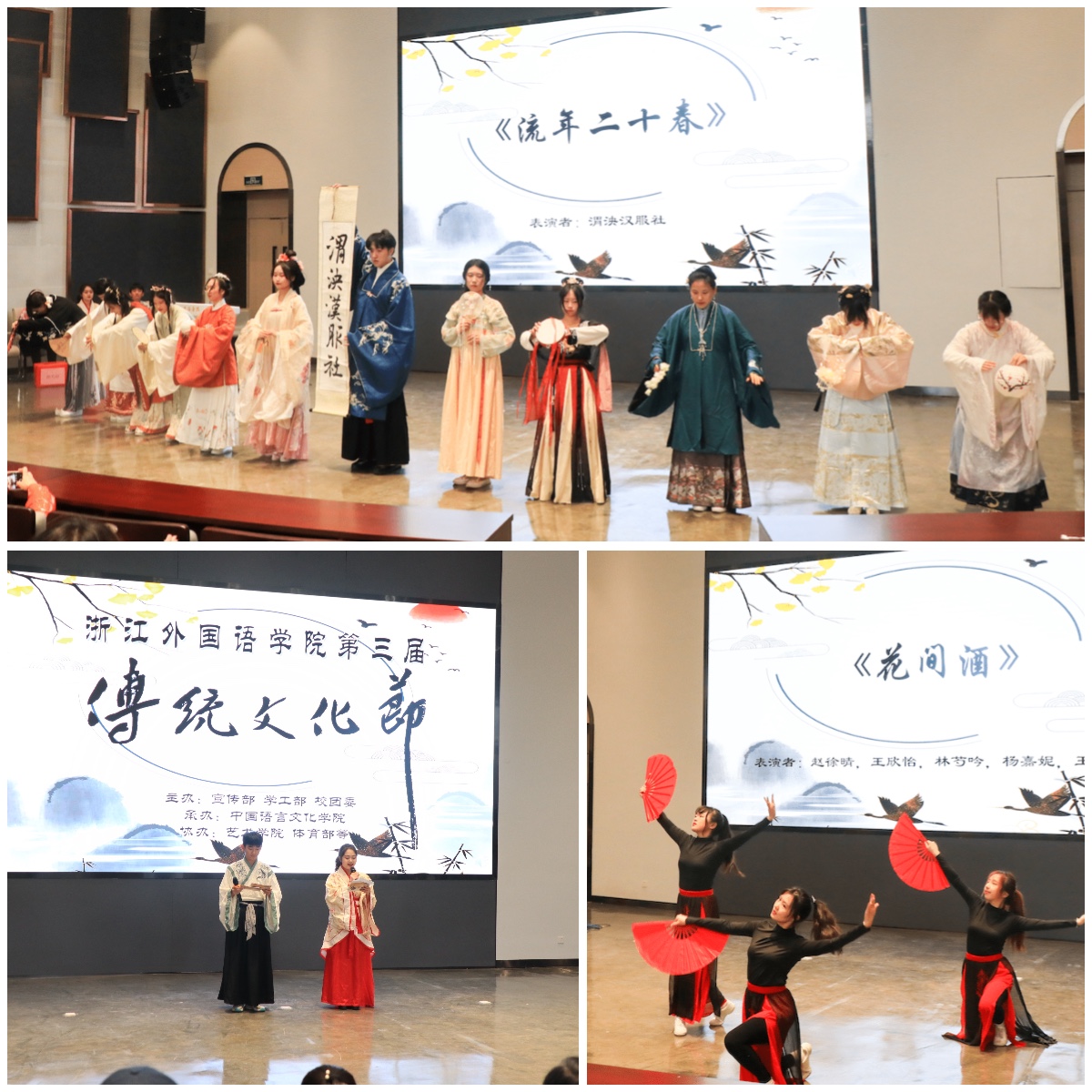第三届传统文化节还创新涵盖了中华经典诵读大赛、杭州歌剧舞剧院带来的高雅艺术进校园——南宋丝竹乐器器乐专场演出、语言游园会、非遗剪纸艺术展、传统才艺进社区活动等。一大批热爱中华传统文化的浙外师生,自觉承担历史重任,继续传承和弘扬好中华优秀传统文化。