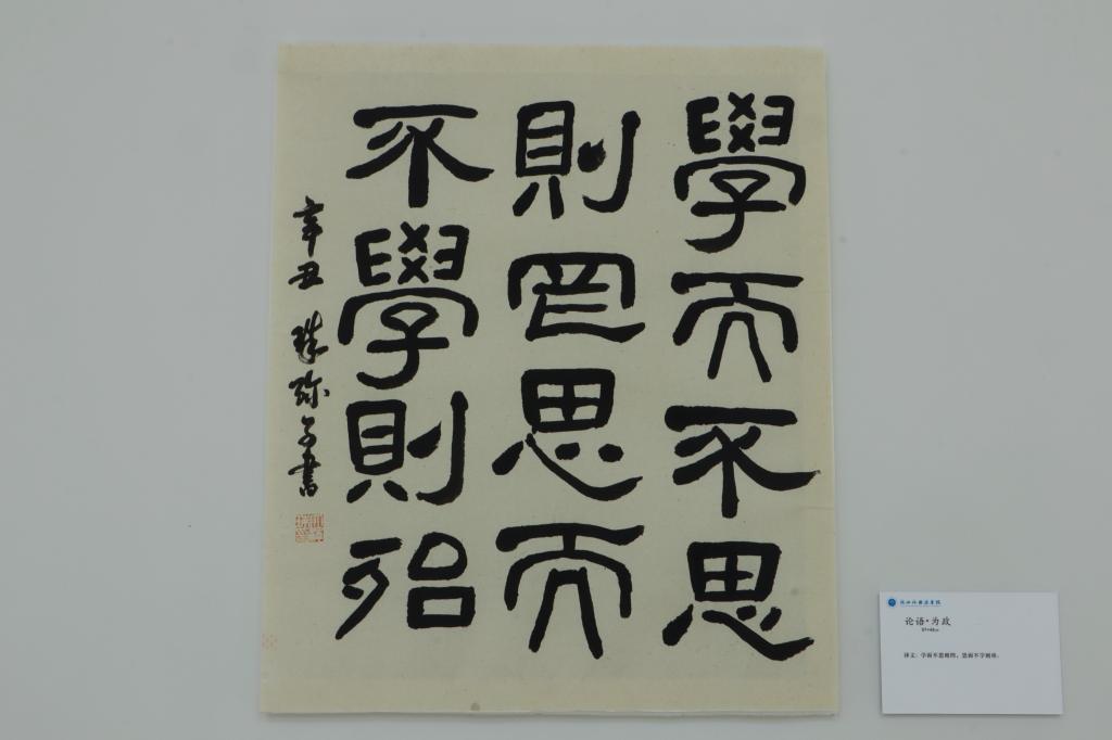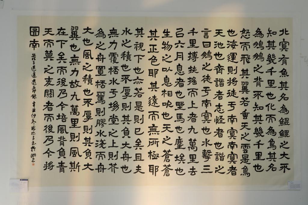 本次展出的三幅作品内容出自《论语》和《庄子》。《论语》的小作品“学而不思则罔,思而不学则殆”和《庄子》的《逍遥游》3米以上的大作品都是仿汉代摩崖碑,用隶书书写而成。“在这个时代,人们可以很容易地一次性获取大量信息,所以人们往往忽视了深度思考,正当我这么想的时候,我看到了论语中的这句话。”大泽老师说。另一幅是庄子的《齐物论》作品,这一篇作品仿照了北魏时期墓志铭的风格,并融入了南方的柔和。