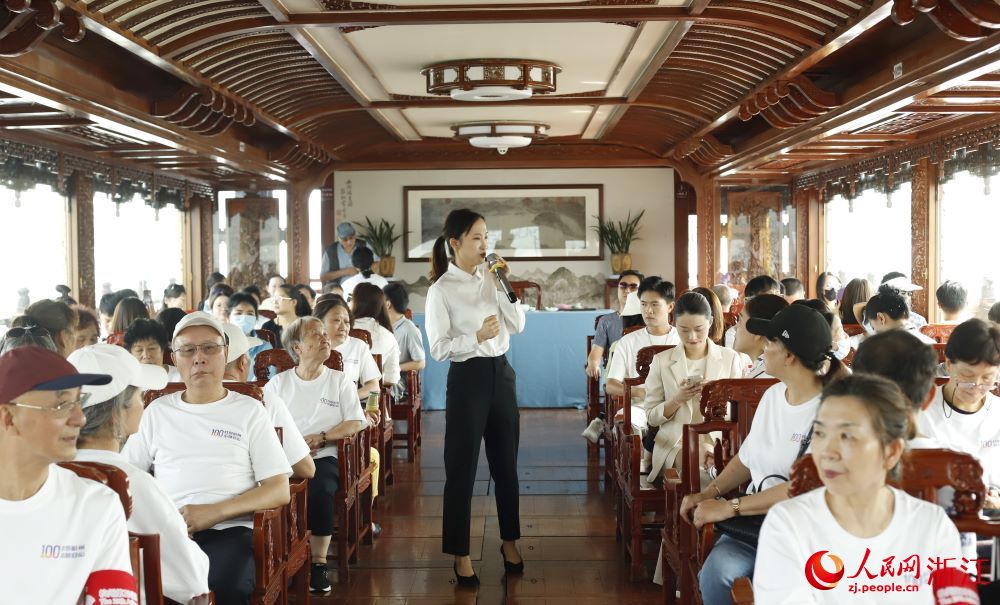 “各位贵宾,大家上午好!欢迎您乘坐杭州西湖风景名胜区的游船游览西湖。我是讲解员丁露赟……”尽管这个暑期“热辣滚烫”,杭州西湖依旧游人如织。丁露赟作为讲解员,正在游船上细心地为游客讲解西湖的风景名胜,解读其中蕴含千年的文化故事。随着她婉转动听的导览,一个个西湖胜景呈现在游客眼前。