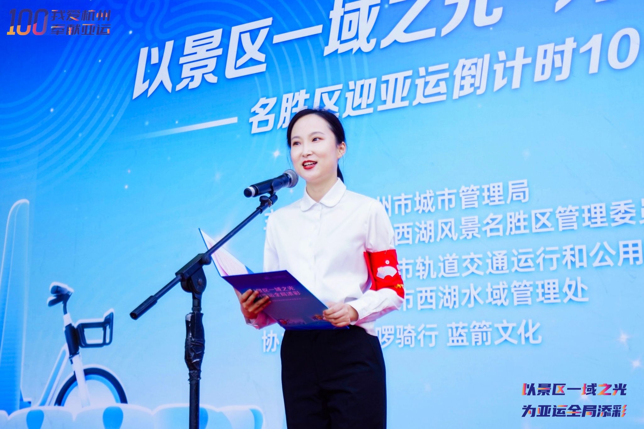 丁露赟作为代表在“西湖风景名胜区迎亚运倒计时100天”活动上发言