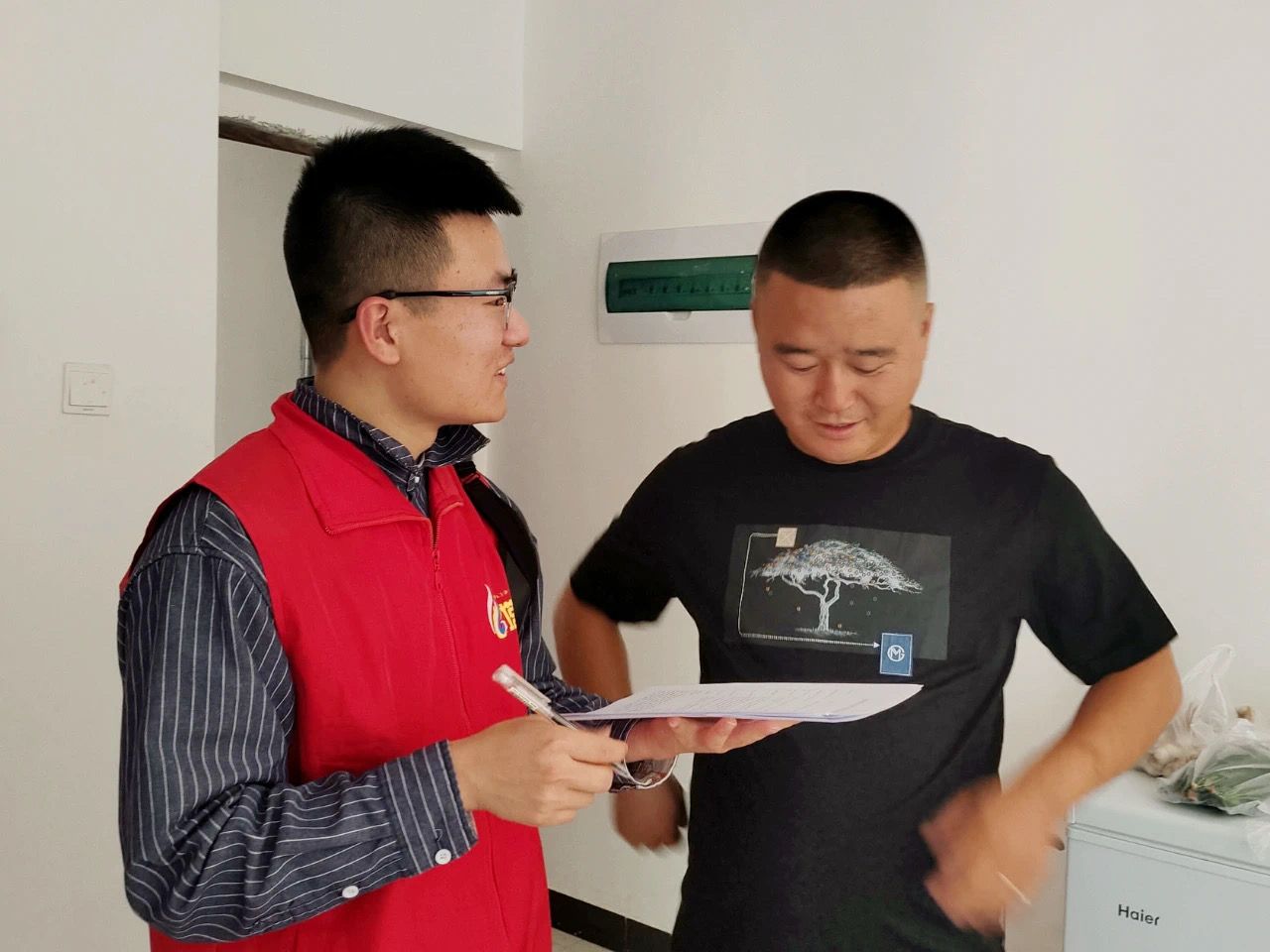 “您好,我们是十六团志愿者,来排查一下燃气安全隐患。”作为党员志愿者,张星昊代表党团支部入户宣讲安全知识、开展排查天然气故障隐患活动。身着红色志愿马甲,拿着问题检查单,从报警器、燃气灶具到燃气管道等,他和同事们一项一项排查隐患,发放燃气安全宣传单,引导当地居民规范安全使用天然气,对没有安装天然气的用户细心引导,帮助他们联系相关部门进行安装。