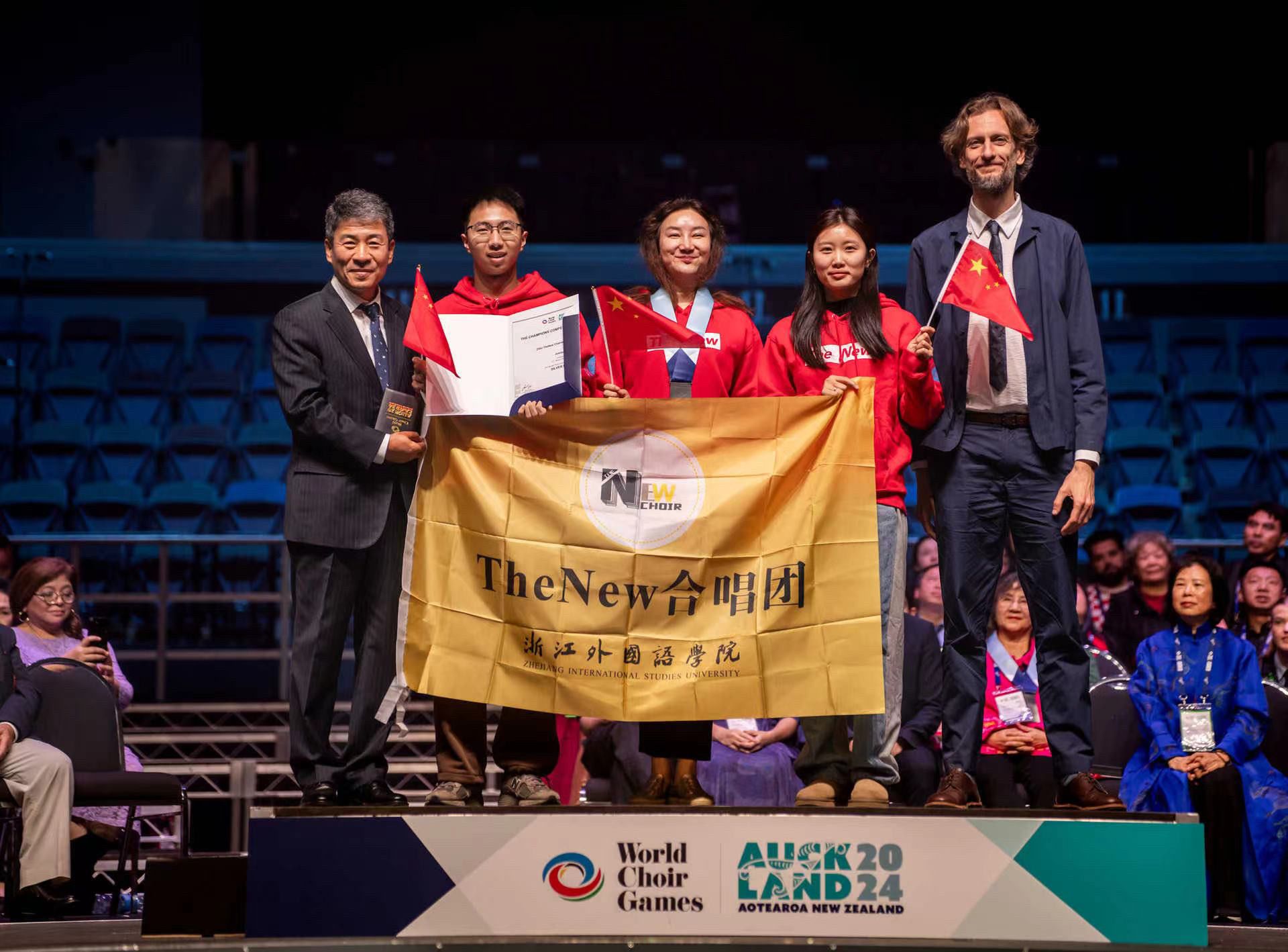 新西兰世界合唱比赛冠军赛颁奖现场,TheNew室内合唱团在领奖。