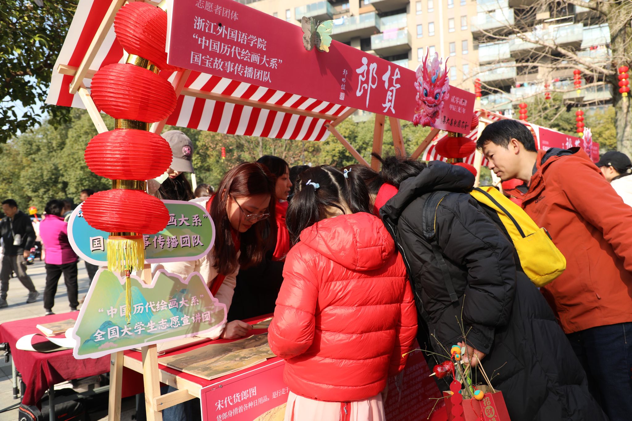 曾参与策划央视纪录片《如果国宝会说话》的青木老师是摊位上深受欢迎的货郎扮演者。当他挑着货担儿、摇着拨浪鼓,从摊位前吆喝走过时,人们不禁眼前一亮——“这不就是《货郎图》中的场景吗?”青木表示:“货郎是古代商业和信息的载体,是行走于城市与乡村的使者。此次与浙外宣讲团联动,创造性地将画作解析与场景表演相结合,形象地展现货郎在古代经济交流和文化传播中的重要功能。同时也想用实际行动告诉大家,中国历代绘画是时代的缩影,这将成为一颗种子,让‘文脉密码’通过‘品读书画’代代传承,这非常有价值。”