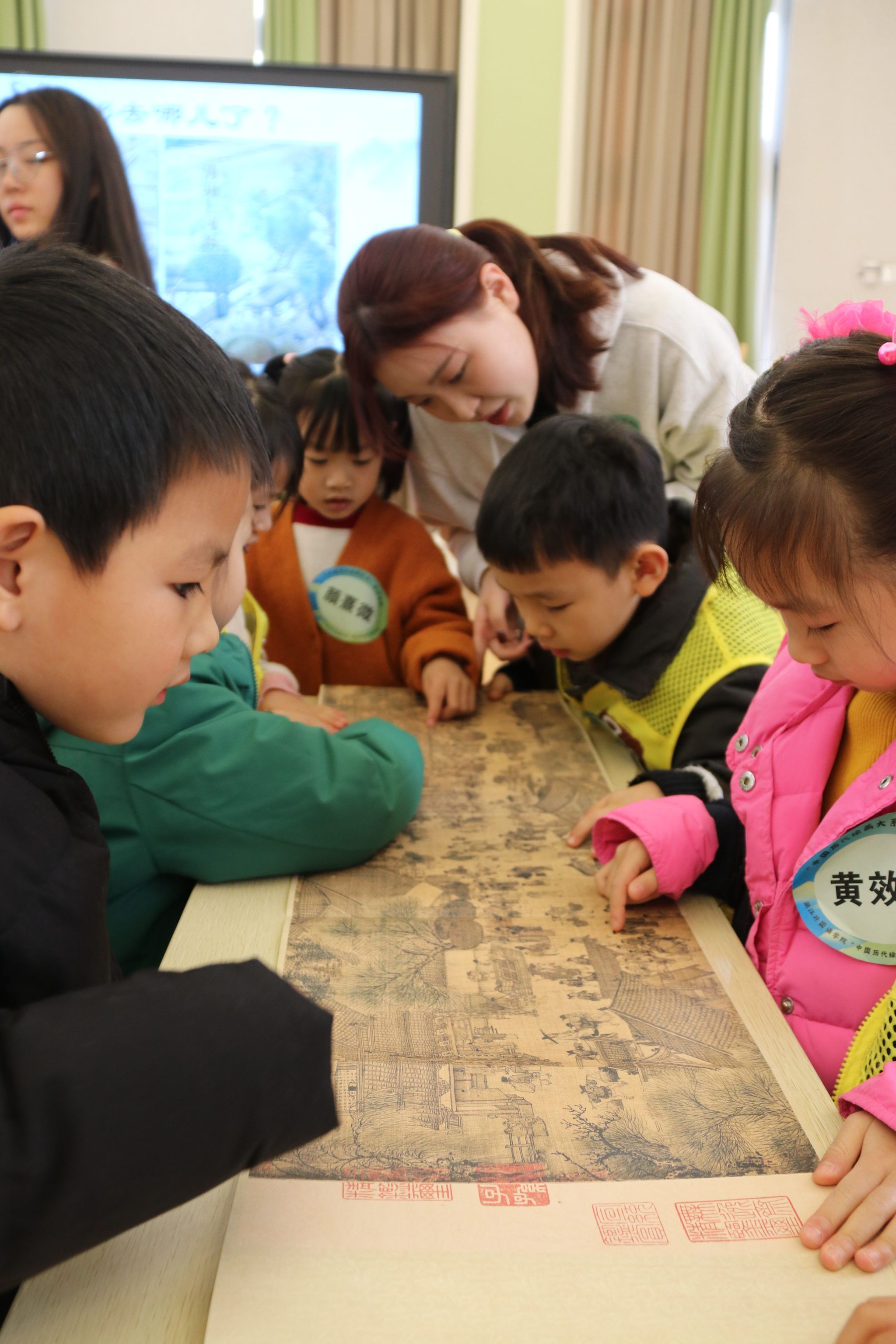 好奇的小朋友们有数不清的问题:“这个货郎扛着这么多商品,应该是刚出发吧?”“为什么这些店有的人很多,有的人很少?”“这里就是古代商业一条街吗?”宣讲员们一边引导大家关注画中的细节,比如《货郎图》中的“三百件”、《清明上河图》中琳琅满目的店铺以及各行各业的人物等,一边详细介绍画作蕴含的丰富内涵。
