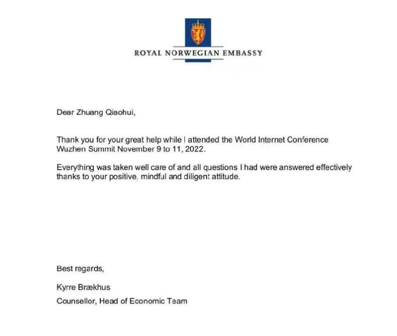 闭幕式后,来自重要嘉宾接待组的庄乔慧就收到了来自她服务的嘉宾、挪威驻华使馆的经济参赞谢喆先生的感谢信,信中对她的服务和帮助给予了高度称赞,并赞赏了她乐观积极、细致周到和勤勉刻苦的态度。这是20级翻译2班的庄乔慧第一次成为“小梧桐”,分配到重要嘉宾接待组,尤其是接待使节团的重要外宾使她内心既忐忑又激动。所以她24小时随时待命,竭尽全力为其服务的VIP扫除各种困难,在能力范围内为其提供帮助。谈及服务的感想,她说谢喆先生对中国共同富裕政策的兴趣使她印象深刻,她也非常自豪地向他介绍共同富裕的内涵。当谢喆先生反问,那中国只管穷人和农村人,就不管富人和城市人口了吗?她有礼有节、从容不迫地解释道:“不是不管,同时也不会打压富人。而是国家鼓励先富带动后富,一部分富裕起来的人通过创业或其它有益的途径,创造和扩大有意义的就业机会来为其他人提供共富的机会。在维护社会公平的同时,无形中也促进了经济发展。这也是共产主义的真谛。”从嘉宾对中国推行的各项政策和各领域的发展趋势、理论创新、科技进步等表现出的浓厚兴趣可以看出,中国在世界舞台上的话语权和影响力是不容小觑的。这让庄乔慧不禁为自己是中国人而感到骄傲!为生在这样一个高速发展的繁荣、和平年代而心怀感恩!她说:“这份难得、充实的志愿经历我会牢牢记在心间,感谢世界互联网大会和学校给我这样一个宝贵的机会,让我看到中国之外的世界,和世界眼中的中国!”