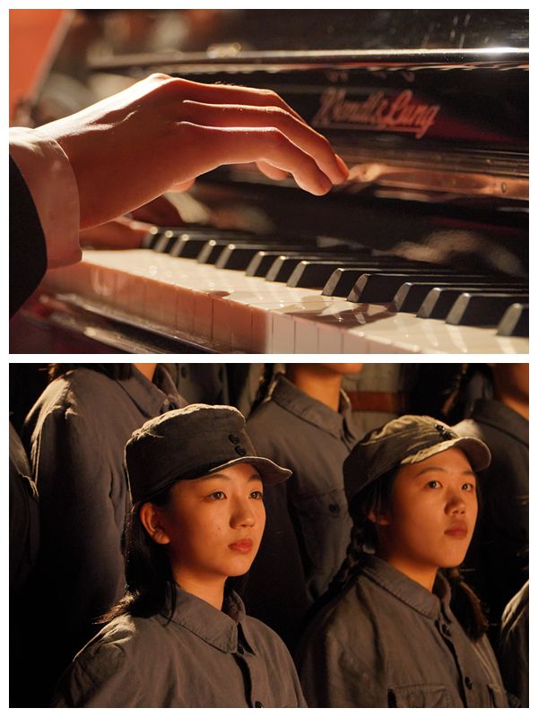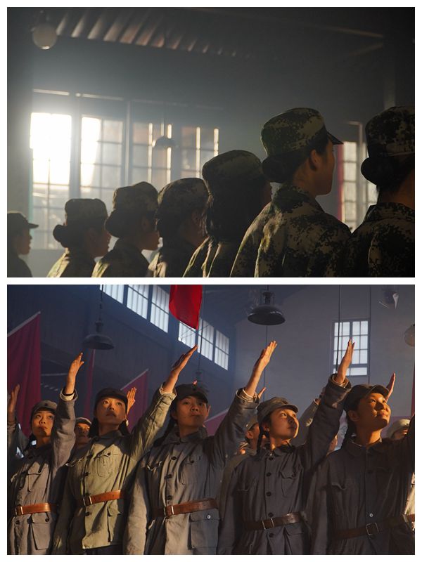 出发时天还未亮,返校时已是深夜,六小时的车程,持续十小时的拍摄,回想起拍摄经历,赵磊同学笑着说:“很辛苦,但也很值得。”最终呈现出的却是不过四十来分钟的画面,“但一个看似简单的镜头,也要在不同角度、运镜的要求下反复录制,有时候一幕也要拍摄一两个小时。”“其实我们每一遍都表现地很好。”他调侃道。不仅如此,“当时的场地条件也十分有限,没有休息的地方,还下起了大雨。豆大的雨点滴在地上,很多同学的鞋子、裤子都湿透着黏在身上。”陈婷婷同学回忆说。加之拍摄时间短暂,同学们要快速换上两三套不同的衣服,并且时常遇到鞋子不配对的情况,为了能够撑起码数过大的鞋子,陈婷婷穿了两双袜子,还在鞋里塞了纸,才能勉强走路。在这样的情形下,同学们没有半分抱怨,反而更加体会到了当年的“苦”,不管是哪一个镜头,第几遍歌唱,都拿出了十二万分的精神状态。