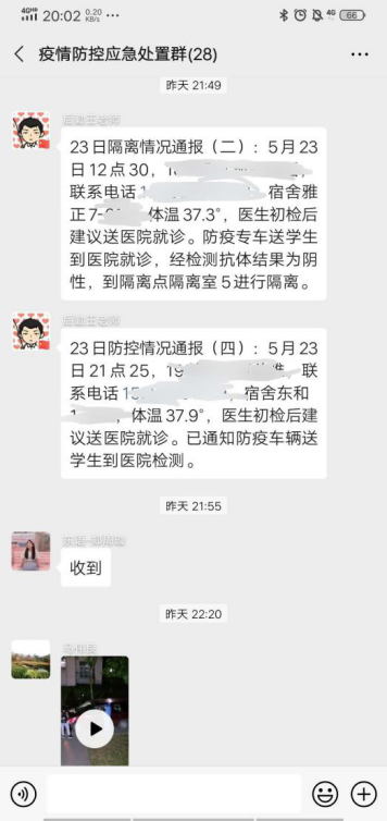 联络员王彭老师是这次后勤应急团队的“包打听”,他每天负责在“疫情防控应急处置”群里通报隔离和解除隔离情况。他要和辅导员持续保持联系,保证学生从去医院到安排隔离点再到消杀,每一步落实到实处。除了联络员王老师,还有宿管阿姨们也在这次战“疫”中发挥了举足轻重的作用。