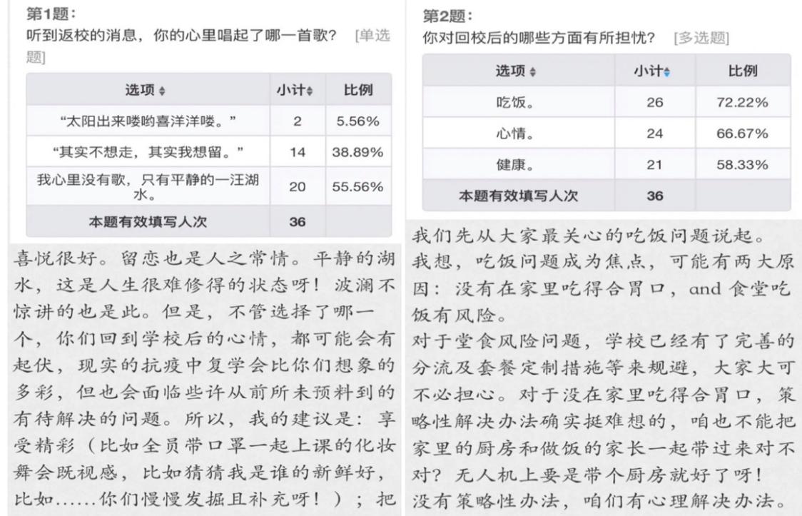 开学了,我们能不能在学校的食堂里“吃好饭”?线下教学能不能和前期线上学习的内容“神同步”?在校园里面能不能“自由行”?这是很多学生最为关心的问题。此时,一份自制问卷应运而生地成了“爆款”,频频地在学生们的朋友圈中转发。