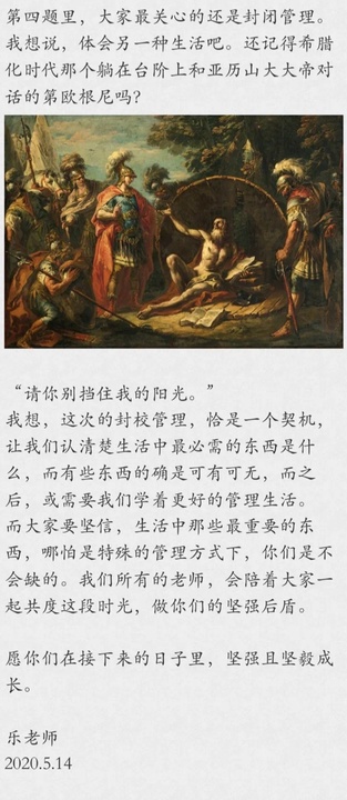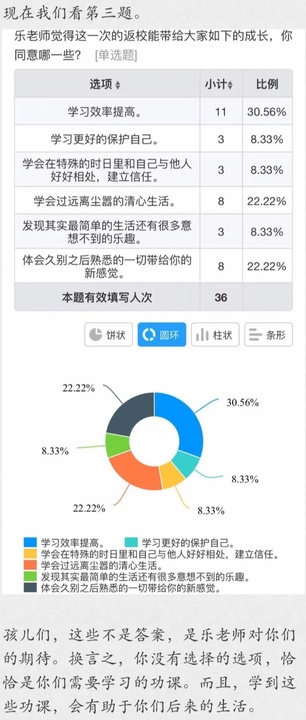 这份问卷,出自英文学院2017级翻译1、2班班主任李乐之手,借助问卷反馈,李老师在线上开展了一次特殊的“返校复学”主题班会,为学生的担忧和顾虑提供了解决思路。比如:应该以何种心态面对此次开学?她建议:不管喜悦还是留恋,返校后的心情都可能会有起伏,但现实的抗疫中复学会比想象的多彩,学会享受精彩。还有食堂用餐问题,她告诉大家:学校已经制定了完善的用餐分流制,并提供套餐定制服务,把用餐风险降到了最低。众口必然难调,学校食堂的菜品未必能让每一位学生吃的合胃口,但一定能吃的健康、吃出免疫力。